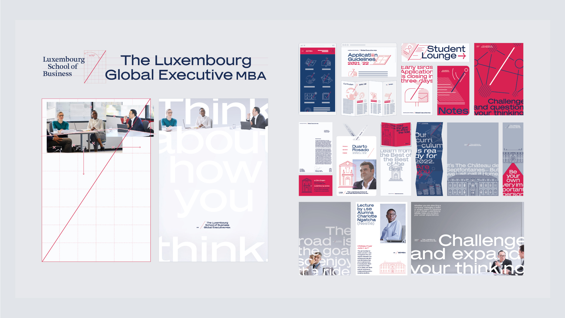 The Luxembourg School of Business is predominantly focused on developing students’ entrepreneurial skills. For its Global Executive MBA program a comprehensive new visual identity was created, based on the school’s pre-existing logotype, typography, and color scheme. The original logotype consisted of a wordmark, monogram (LSB) and a red line dividing them — all of which inspired a new creative solution. The angled red line is implemented in pictograms and illustrations, its slope and length define the typographic layout grid and even dictate the format and margins of printed materials.