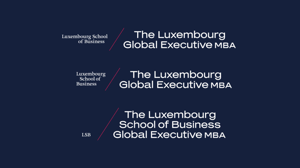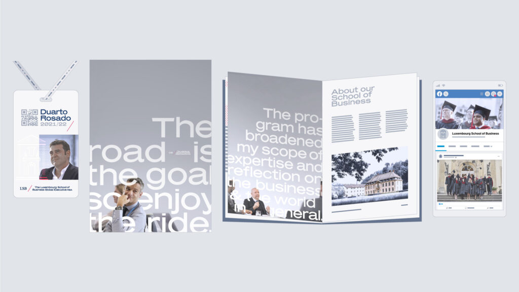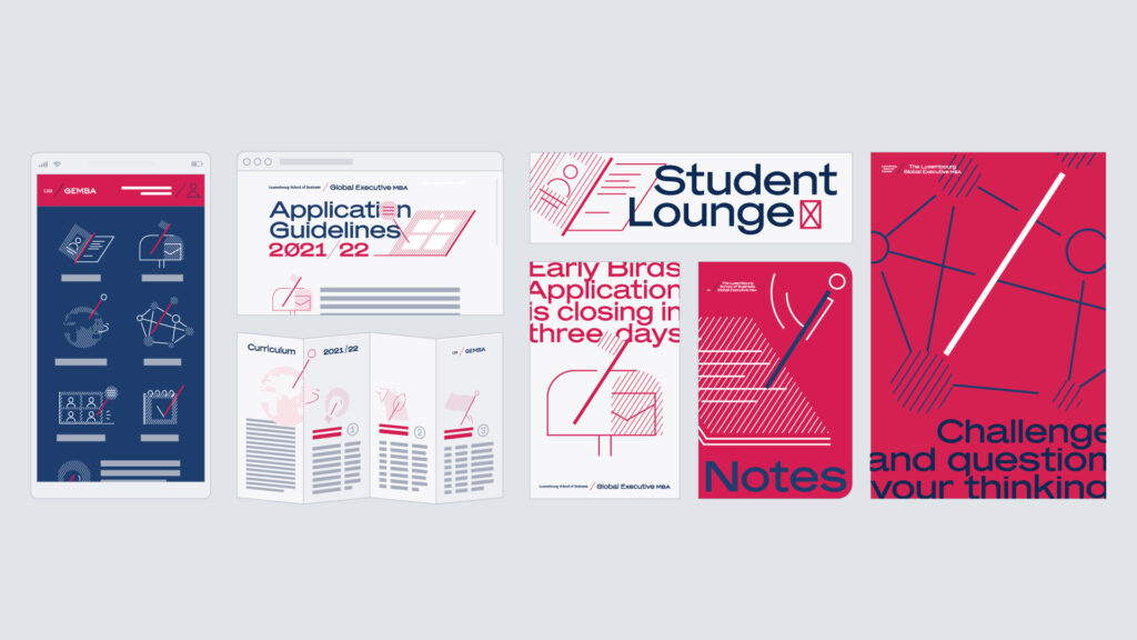 The Luxembourg School of Business is predominantly focused on developing students’ entrepreneurial skills. For its Global Executive MBA program a comprehensive new visual identity was created, based on the school’s pre-existing logotype, typography, and color scheme. The original logotype consisted of a wordmark, monogram (LSB) and a red line dividing them — all of which inspired a new creative solution. The angled red line is implemented in pictograms and illustrations, its slope and length define the typographic layout grid and even dictate the format and margins of printed materials.