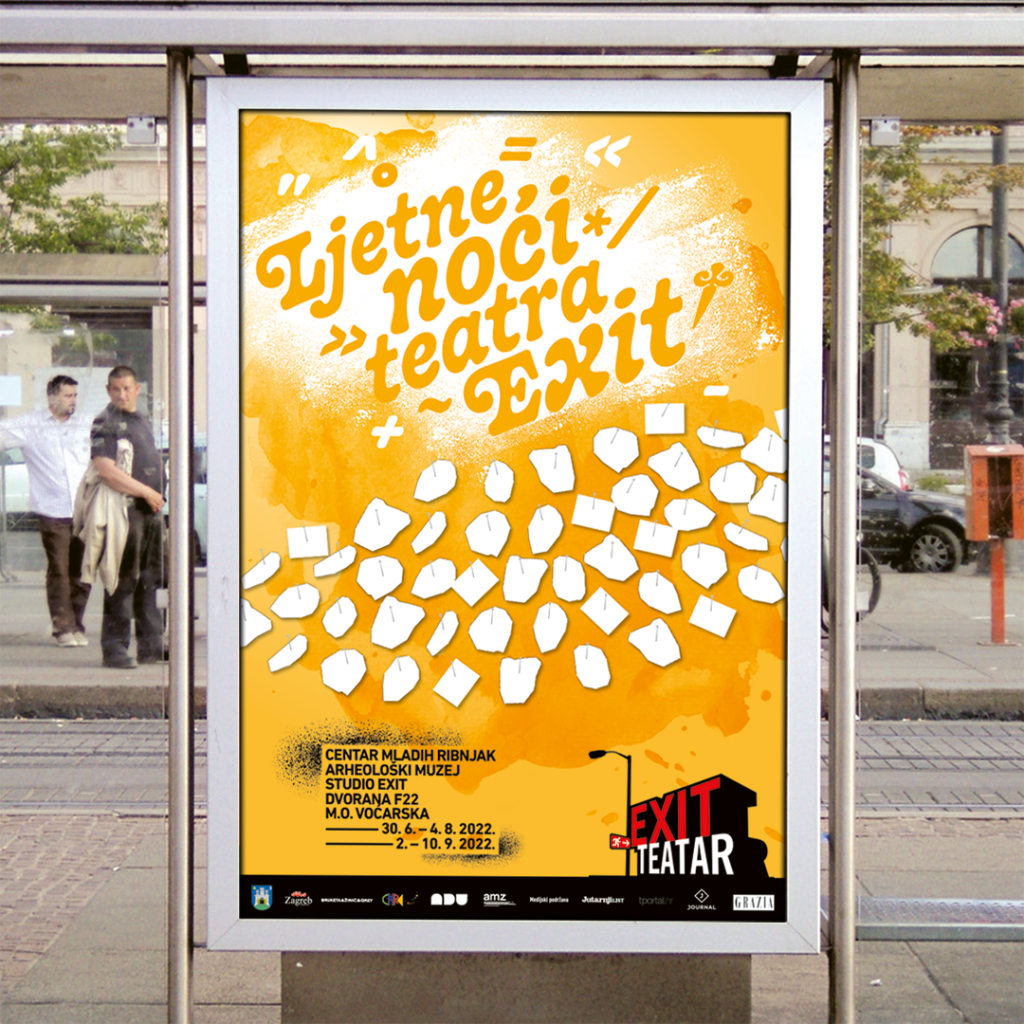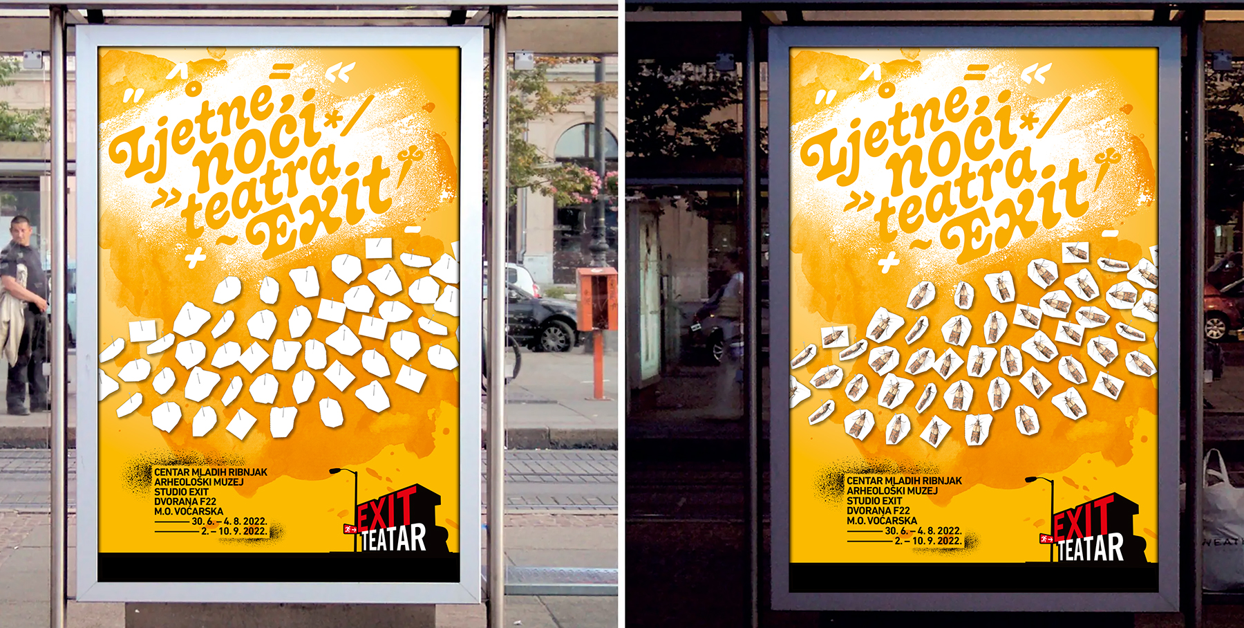 On warm summer evenings you can never be alone, since you will always be accompanied by moths attracted by street lamps and spotlights. Rattling and fluttering around your head, the night flying insects enjoy the show in their own flamboyant, butterfly-like fashion, clad in their tiny velvety evening frocks and tuxedos. These fully fledged members of the EXIT Theater audience inspired the idea for design. The diurnal version of the citylight poster is void of moths, dotted with empty seats to be taken by the nocturnal flyers, equal members of the audience, in the evening, when they show up, all in their seats, their gaze turned towards the EXIT Theater Summer Nights.