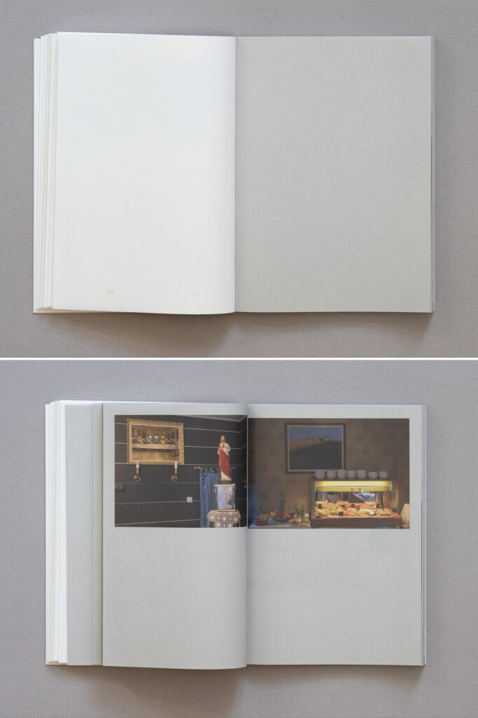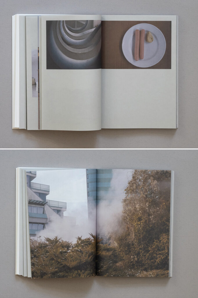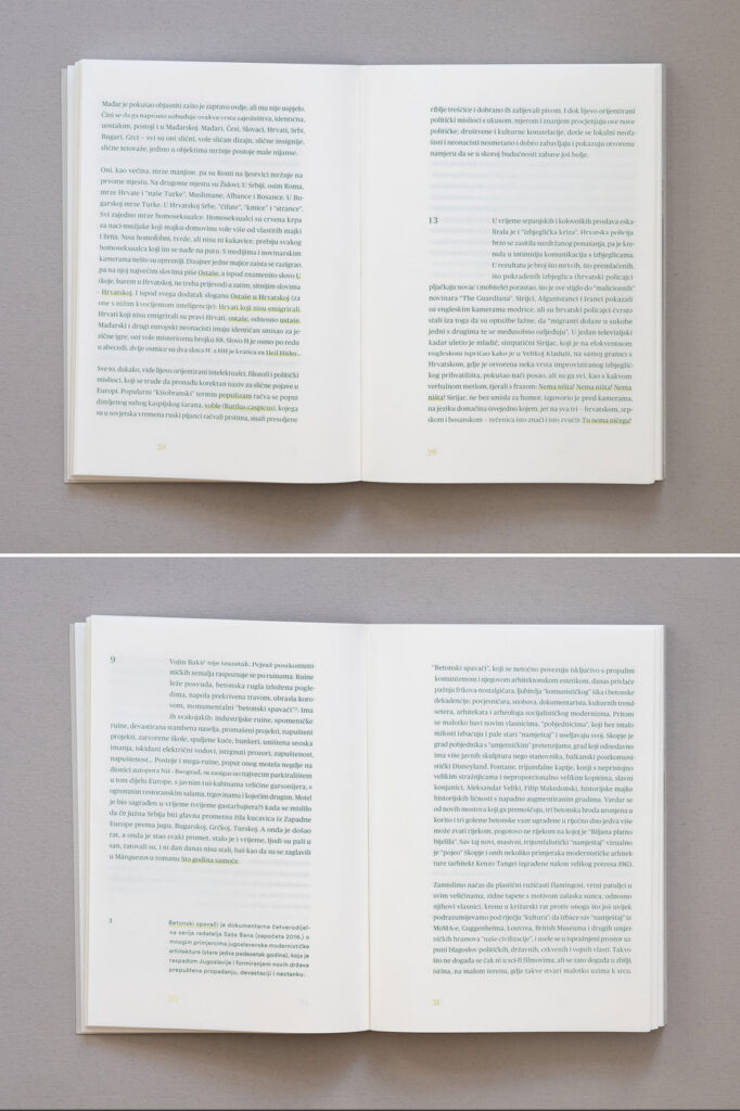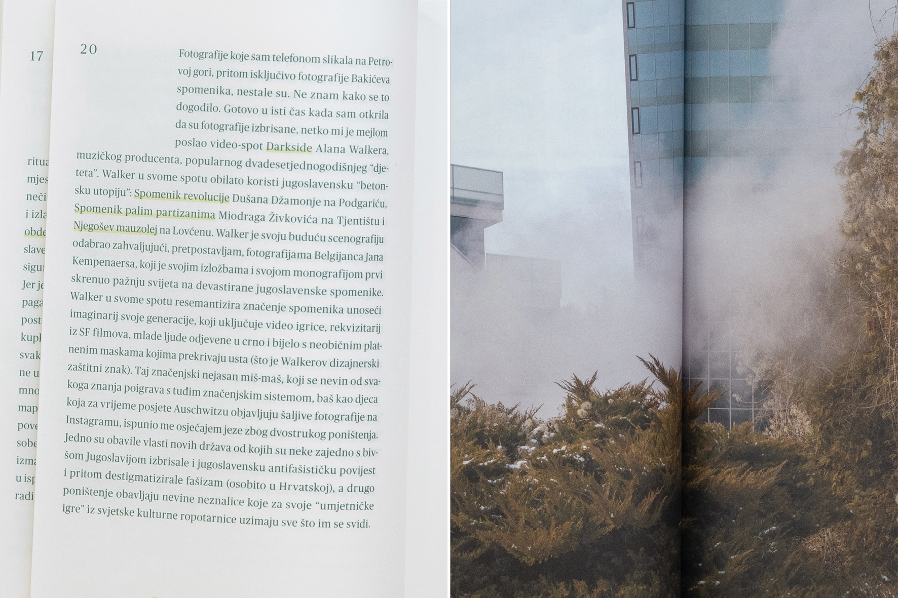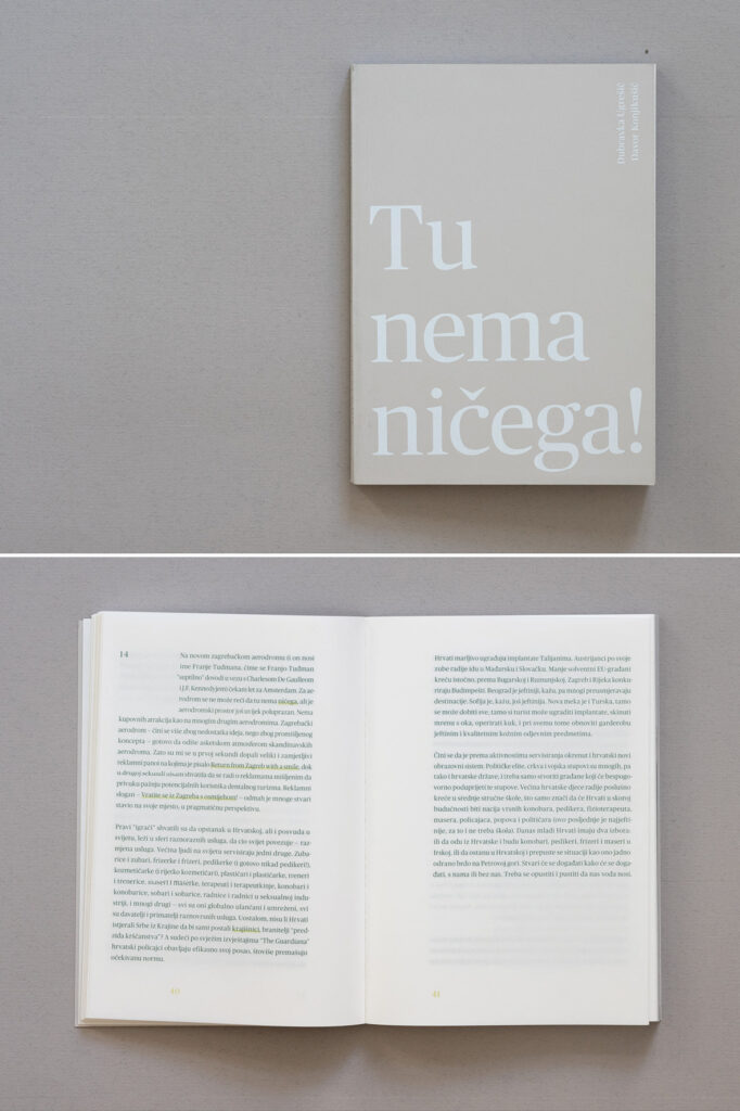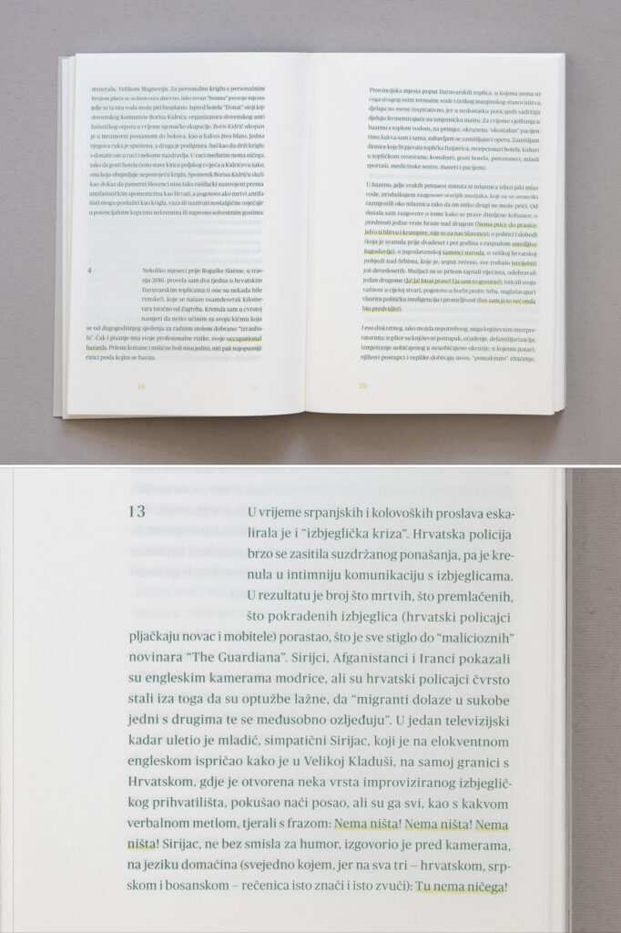 The design of the publication unites two coordinated, but autonomous artistic narratives into one object. The essay There’s Nothing Here by Dubravka Ugrešić, who, through the theme of baths and spas, questions the continued permeation and presence of nationalist discourse in small communities, is followed by the photo narrative by Davor Konjikušić, who records the theme and artistry of the same motifs, but in another medium. The book combines two approaches to the same topic by using partially transparent and tactilely expressive paper, which aims to suggest the non-existence of separate moments and places, that is, the existence of all places and thoughts at once in the same space.