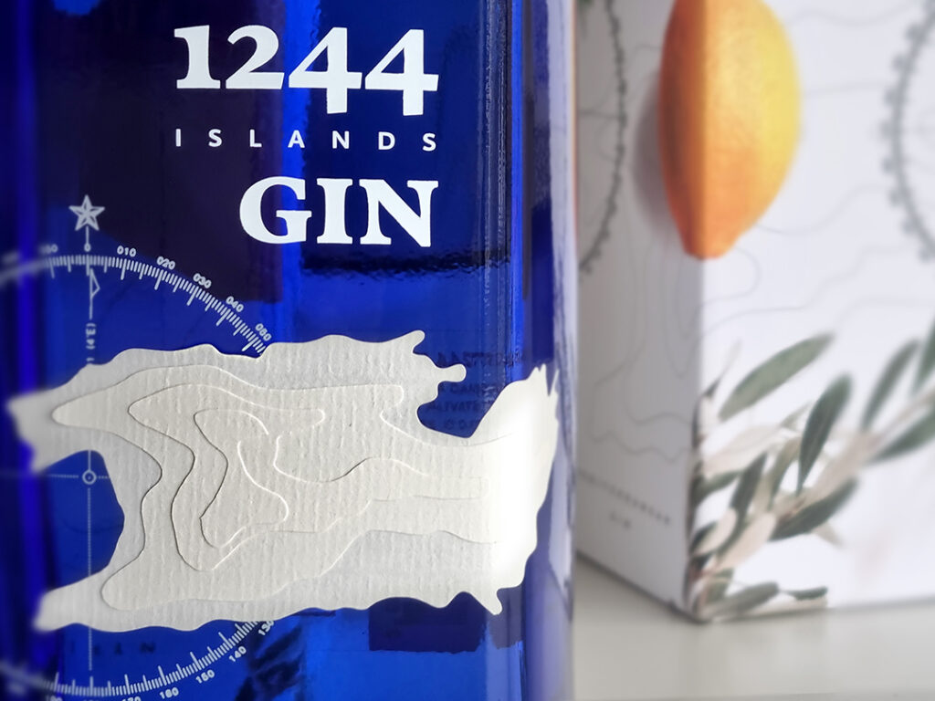 There are 1244 islands in the Adriatic Sea. Each of the islands has it’s own flavour, spice or simply a citrus tree or two more than the next one… These differences are the base of the concept for the premium craft 1244 Islands Gin. Each new distillation is a trip to antoher island, and the recipe and flavour adapt to destination. Lemons and rosemary from Vis island are subjects of the first edition, so the front label imitates the shape of Vis accordingly. It’s made of paper in several layers, just like a topographic map, while the other elements are printed directly on the bottle.