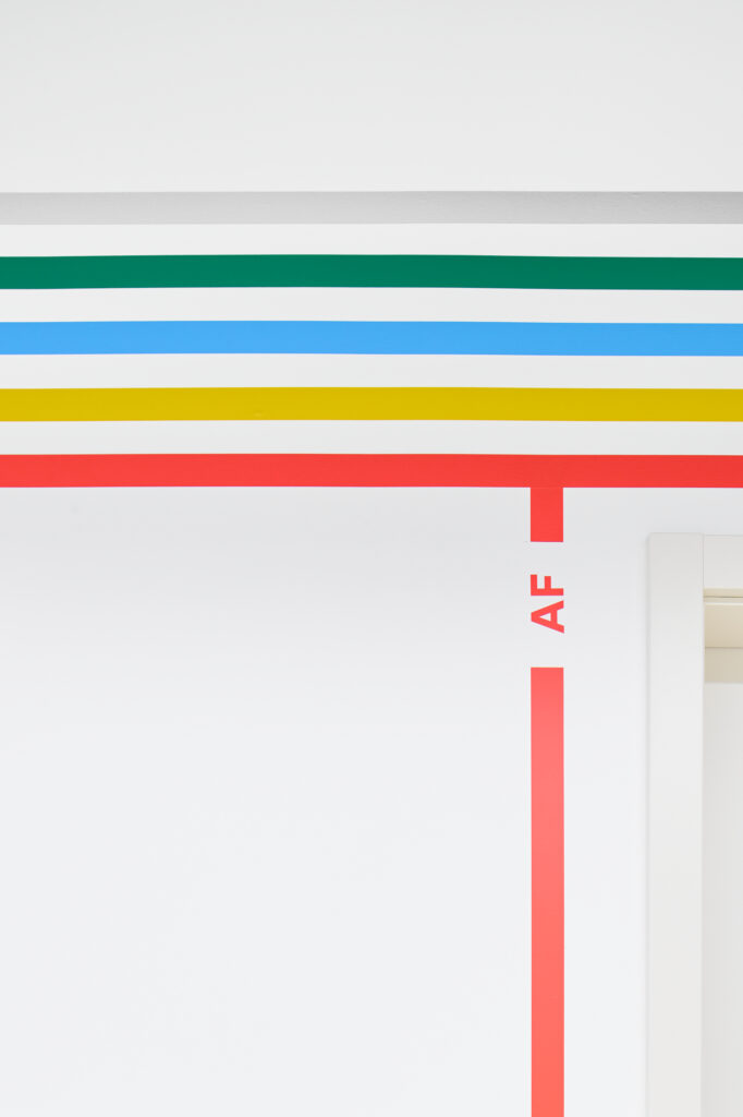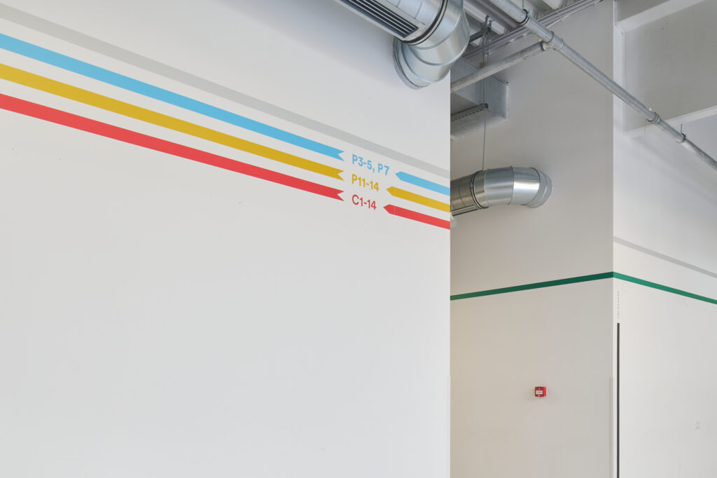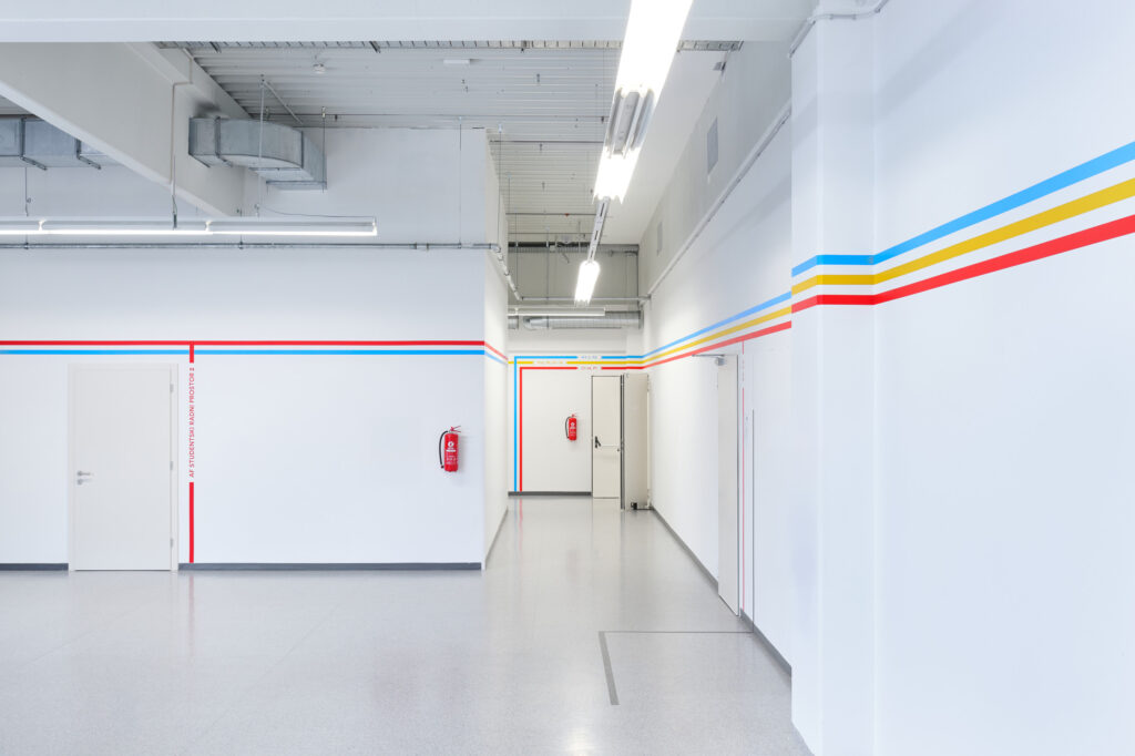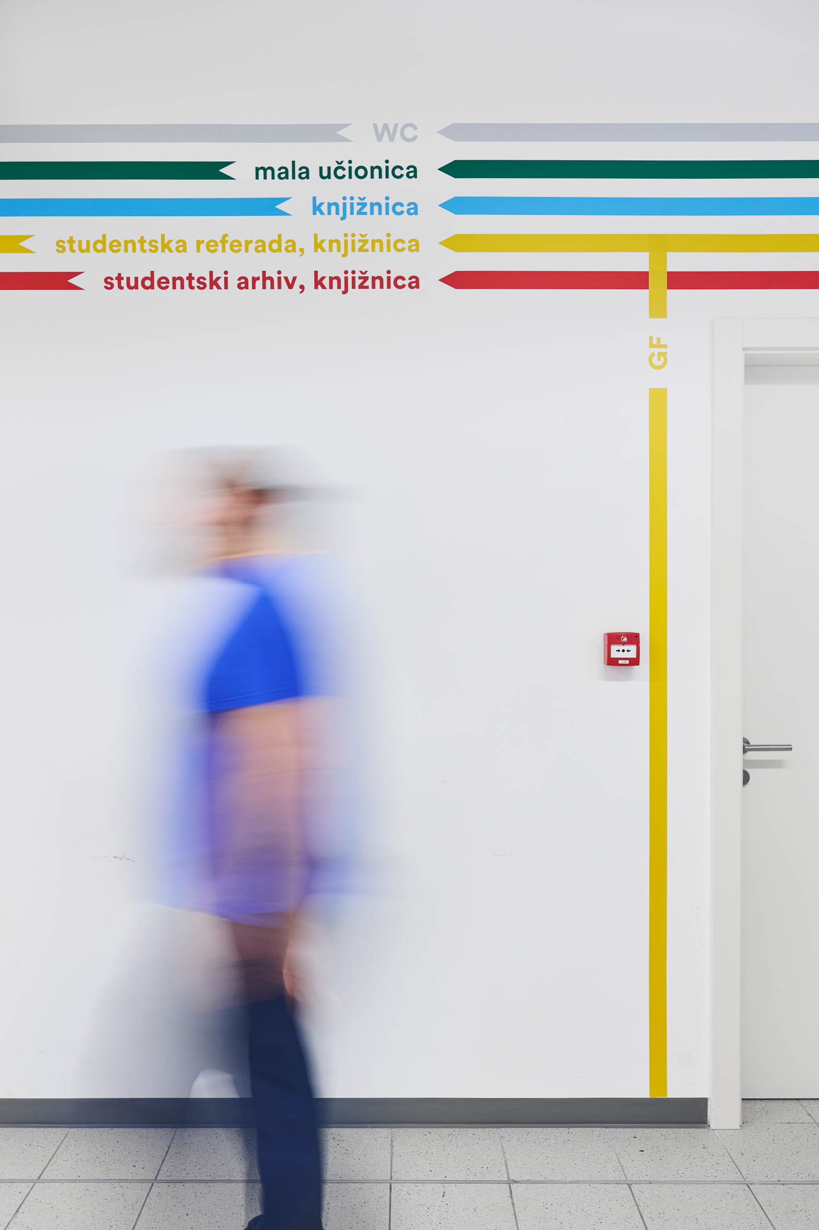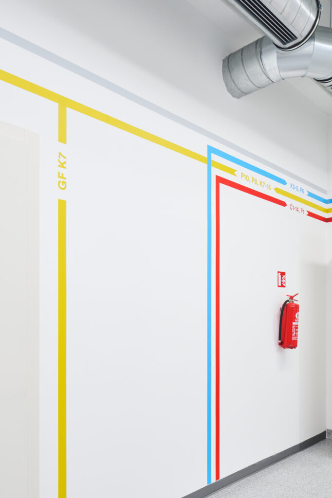 The signage design for the temporary space of four technical faculties in the Tekstipromeat building combines functionality and emphasized linear graphics to facilitate orientation in a new environment and promote interdisciplinary connectivity. At the entrance, each faculty—Architecture, Civil Engineering, Geodesy, and Mechanical Engineering and Naval Architecture—is defined by a specific color. These colors then continue as continuous lines that guide users through the space, extending to their specific destinations. The intertwining of lines symbolically represents the interlacing of technical knowledge, ensuring simple navigation through spaces originally unsuited for education.