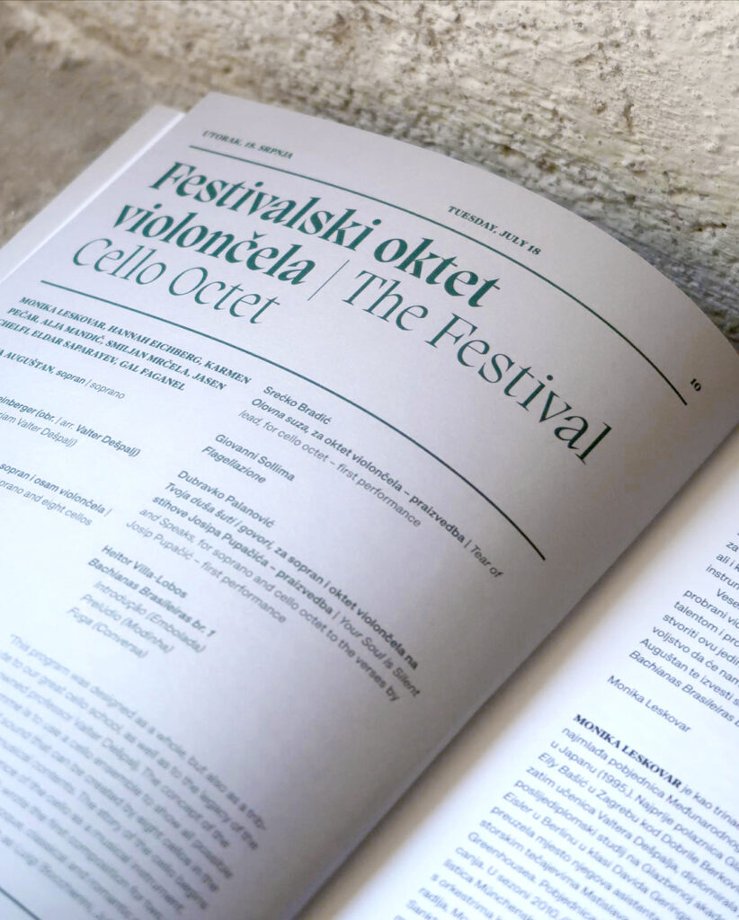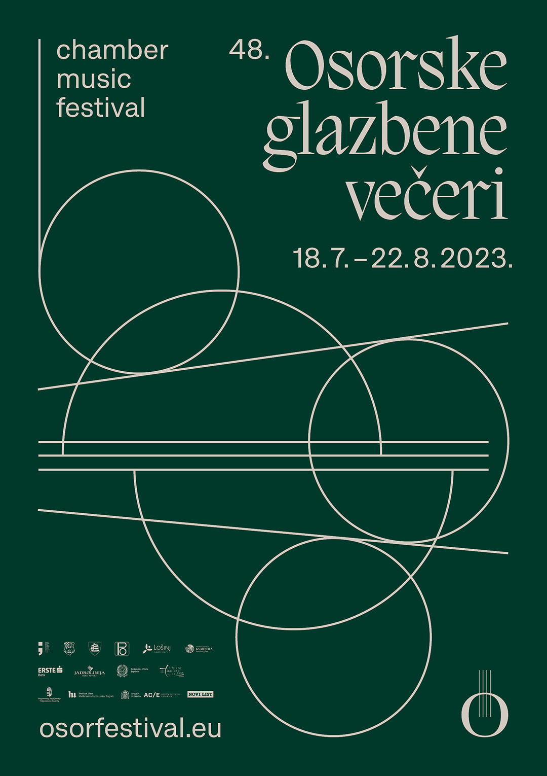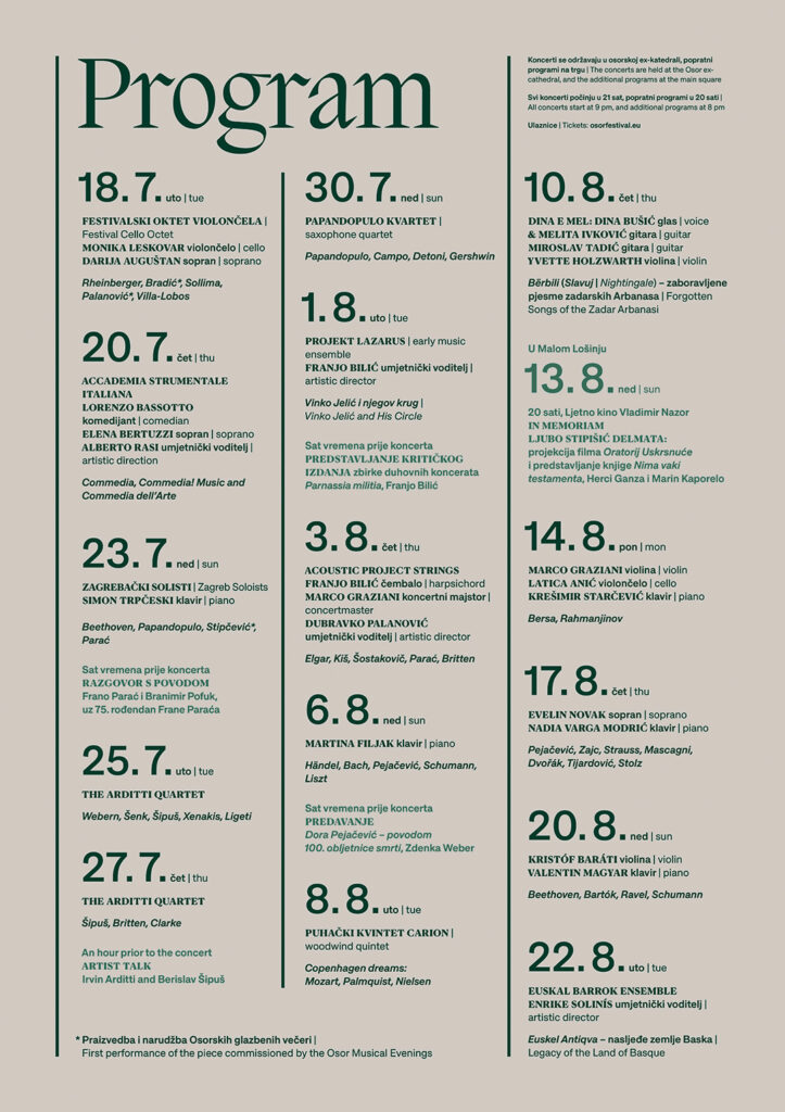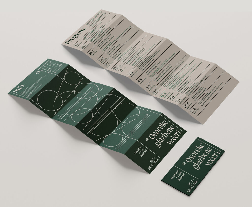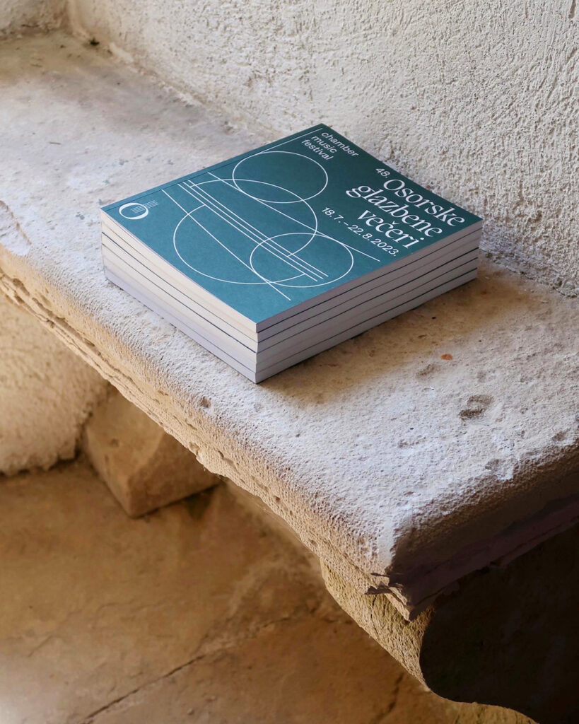The Osor Musical Evenings are a chamber music festival with a long tradition. The festival programs, in addition to canonical classical music pieces from all periods, examine works of key figures of modern and contemporary music in Croatia. In addition to a traditional repertoire, the festival commissions new compositions to be debuted every year, with the goal of encouraging the creation of Croatian musical works. For this edition of the festival the geometric elements from the previous edition were reused, reshaped into a new abstract composition, giving emphasis to contemporary classical music, a significant component of the festival.