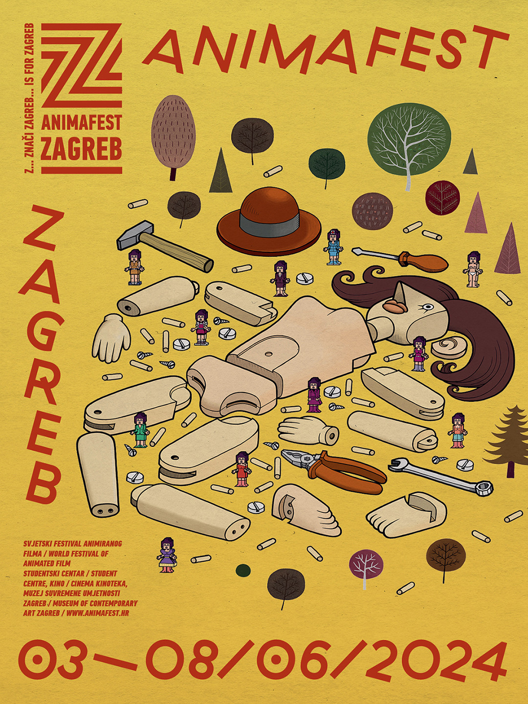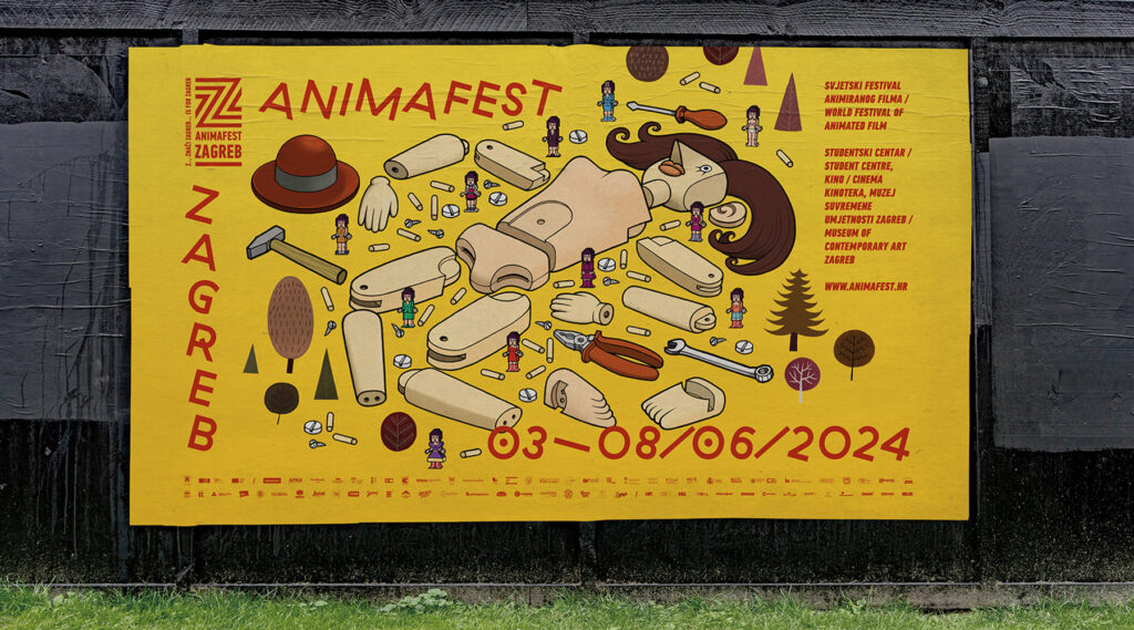 The inspiration for the design of last year’s Animafest visuals was the “deconstructed” composition of an illustration by Irena Jukić Pranjić. This approach allows for the continuous dismantling and reassembling of the illustration’s elements into new combinations with text and other visual components.