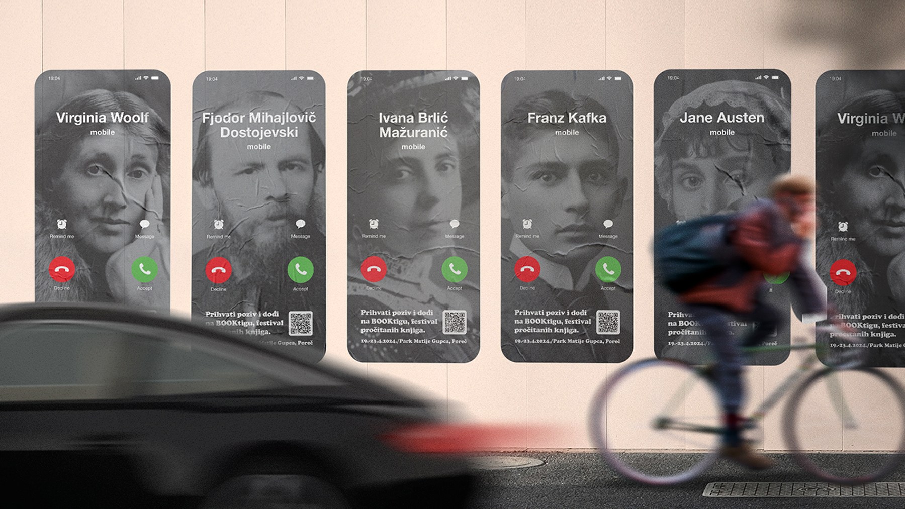 For the 17th BOOKtiga festival, posters were designed to revive iconic writers V. Woolf, Kafka, Dostoevsky, J. Austen, I. B. Mažuranić. Each poster contains a QR code, which, when scanned, provides an authentic invitation from the writers, with AI-generated voices designed to sound as if they are speaking Croatian. The QR code leads to a website where users can leave their details to receive a book with a dedication from the author, available at the festival. Campaign achieved significant success with 3139 web visits, 3316 listened conversations, and 202 registrations for books. 70,000 users liked, shared, and repeatedly listened/watched the writers’ invitations and the call to Booktiga.