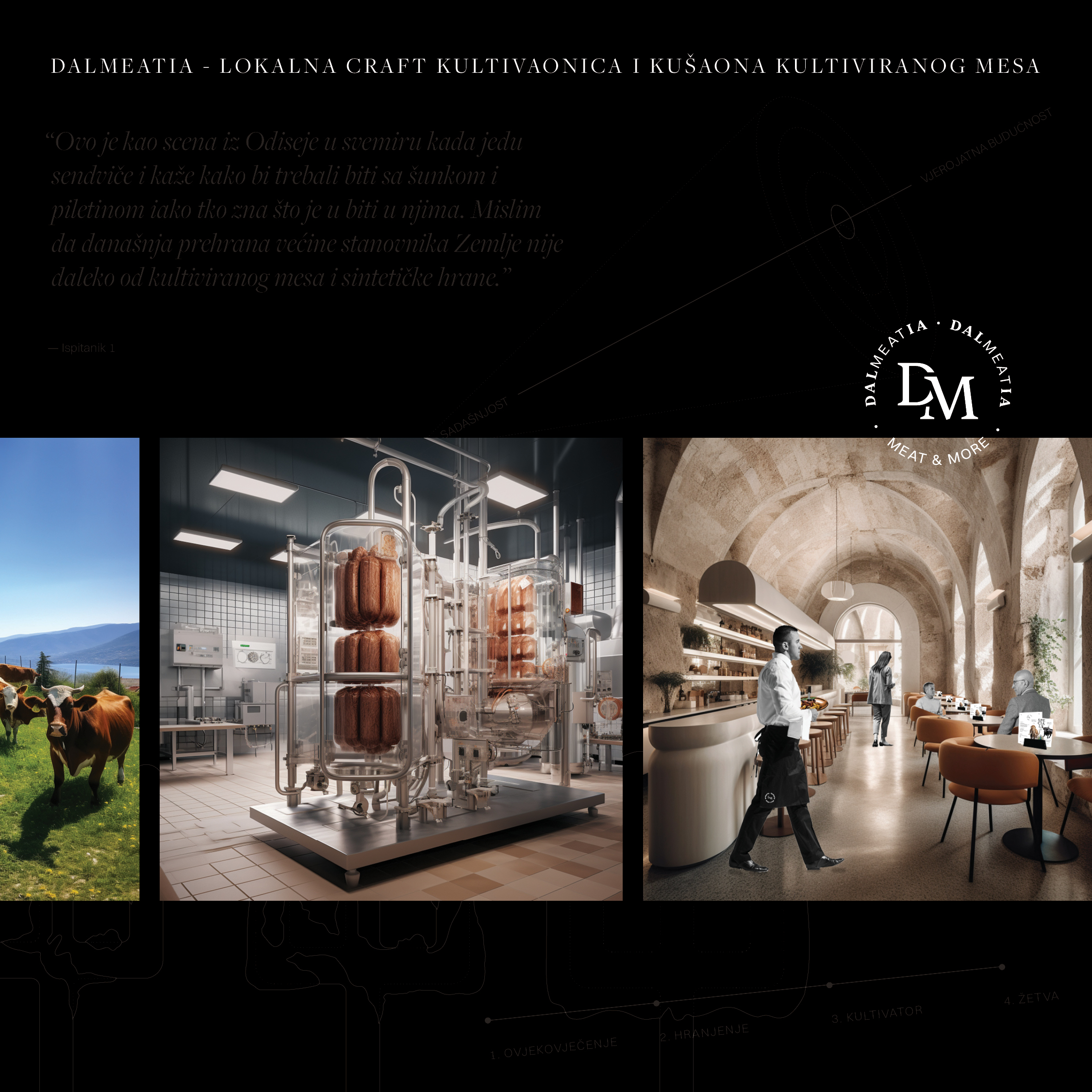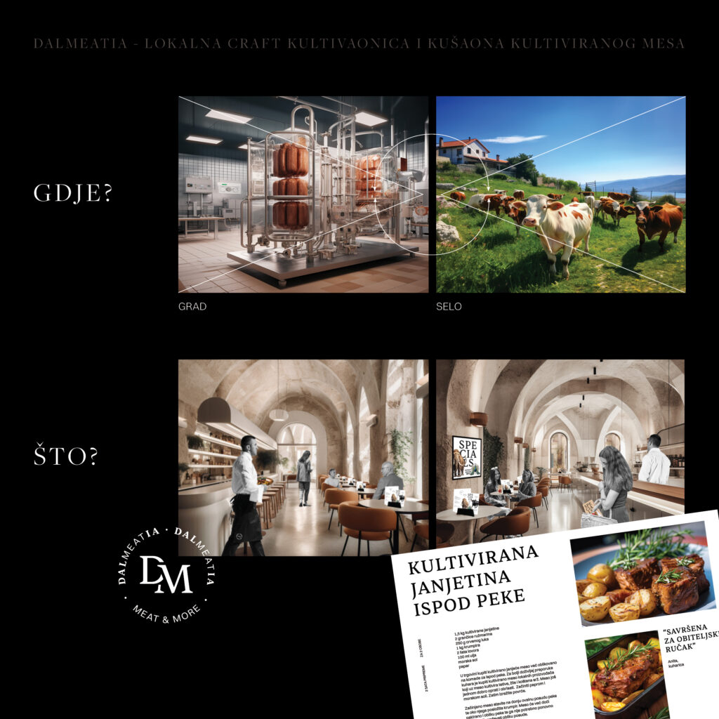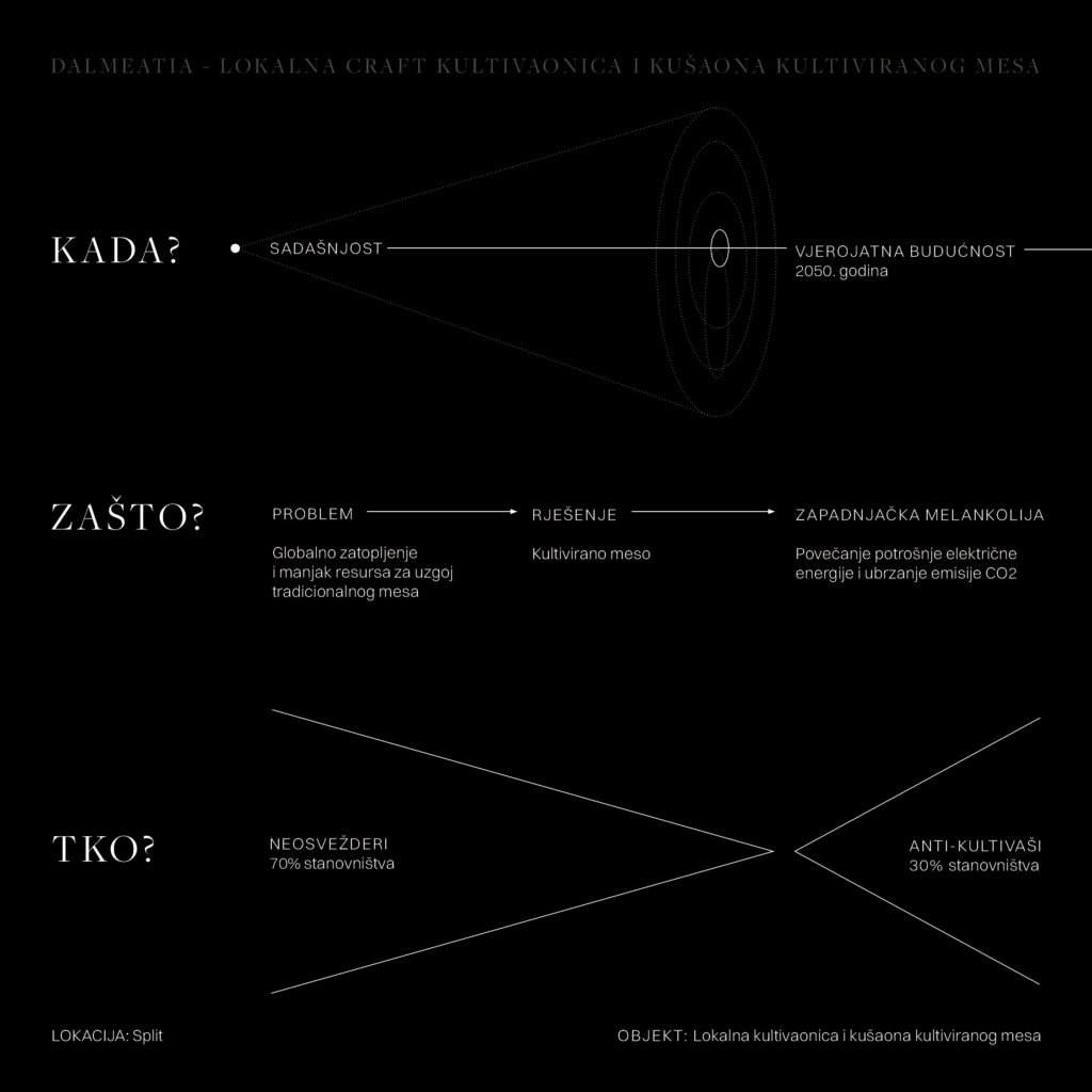 Dalmeatia – local craft cultivation and Cultivated Meat Tasting Room is a speculative design project that explores the future of food and the impact of technology on meat production. It offers insight into a possible future scenario and examines the community’s reactions through the design of a fictional local cultivation facility. The project anticipates gastronomic offer trends in Split and, by situating the scenario in the near future, reflects the introduction of cultured meat to markets in Australia and the USA. It aims to critically reflect on the hyperinflation of hospitality venues and the city’s tourism offerings.