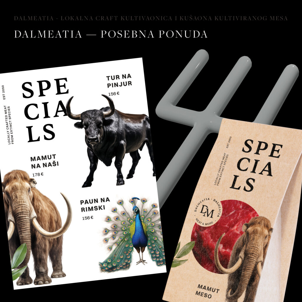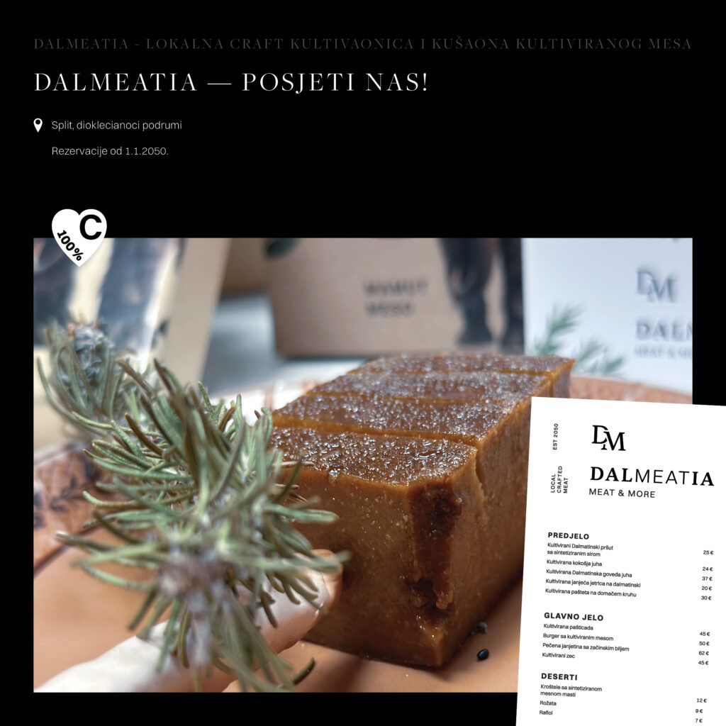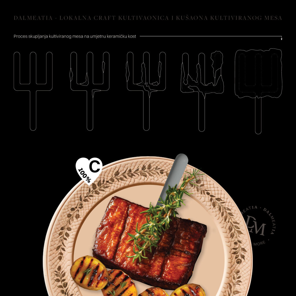 Dalmeatia – local craft cultivation and Cultivated Meat Tasting Room is a speculative design project that explores the future of food and the impact of technology on meat production. It offers insight into a possible future scenario and examines the community’s reactions through the design of a fictional local cultivation facility. The project anticipates gastronomic offer trends in Split and, by situating the scenario in the near future, reflects the introduction of cultured meat to markets in Australia and the USA. It aims to critically reflect on the hyperinflation of hospitality venues and the city’s tourism offerings.