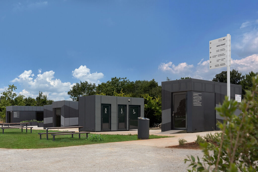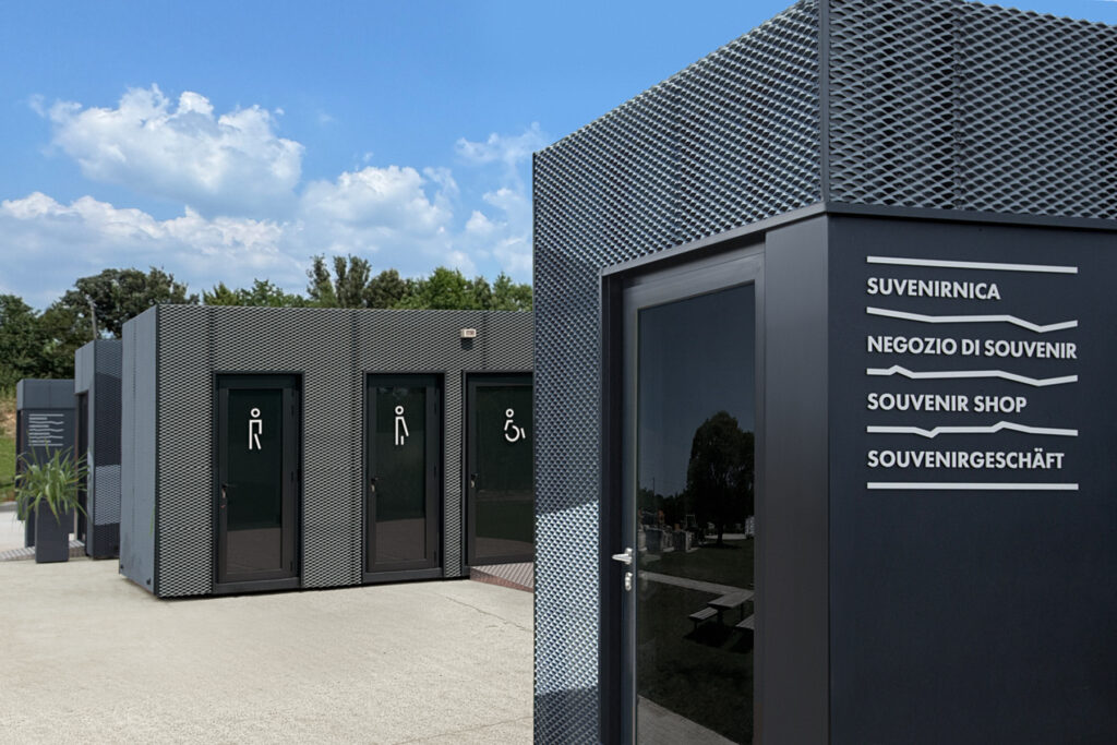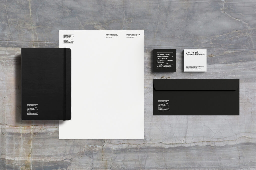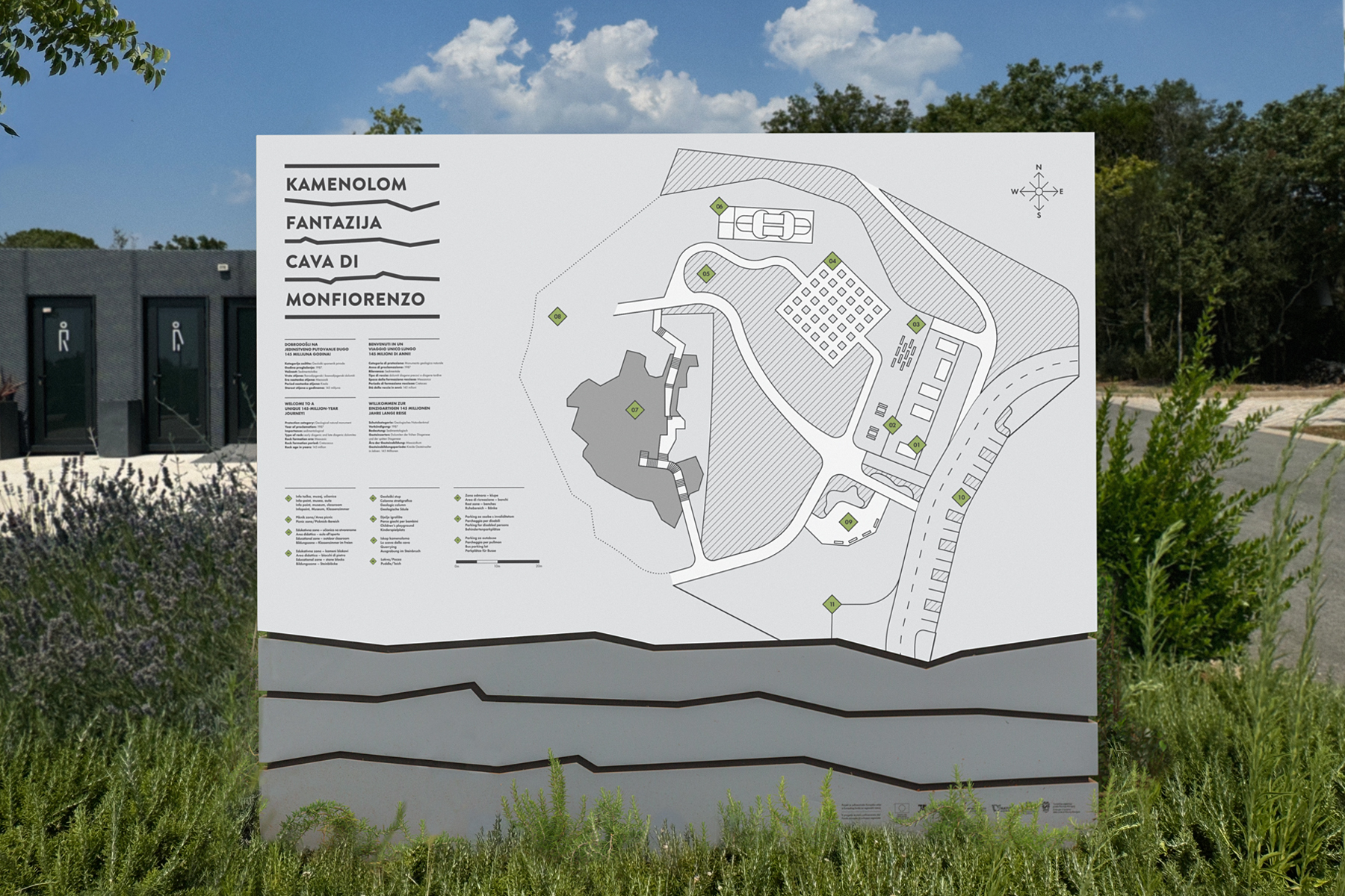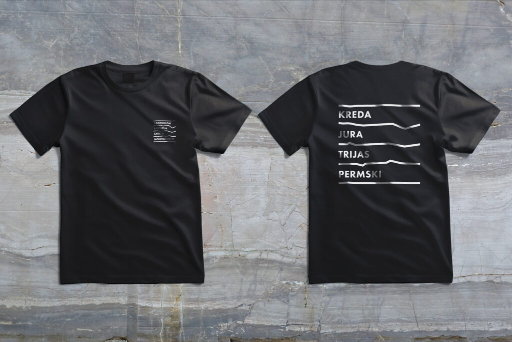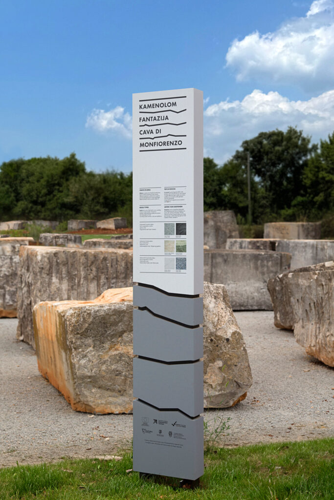 The Quarry of Fantasies is a unique example of sedimentology of carbonate rocks and one of the most interesting quarries in the world. The quarry’s name inscriptions in Croatian and Italian, within the visual identity, are written between winding lines that depict the stratification of the earth. In this way, we read the title between the lines, just as the rocks from the quarry serve scientists to decipher natural sediments that reflect the rich geological history of the area. In the application of the visual identity on different materials, the inscriptions alternate instead of the title. The signage system integrates these elements, materializing them on totems in a three-dimensional form.