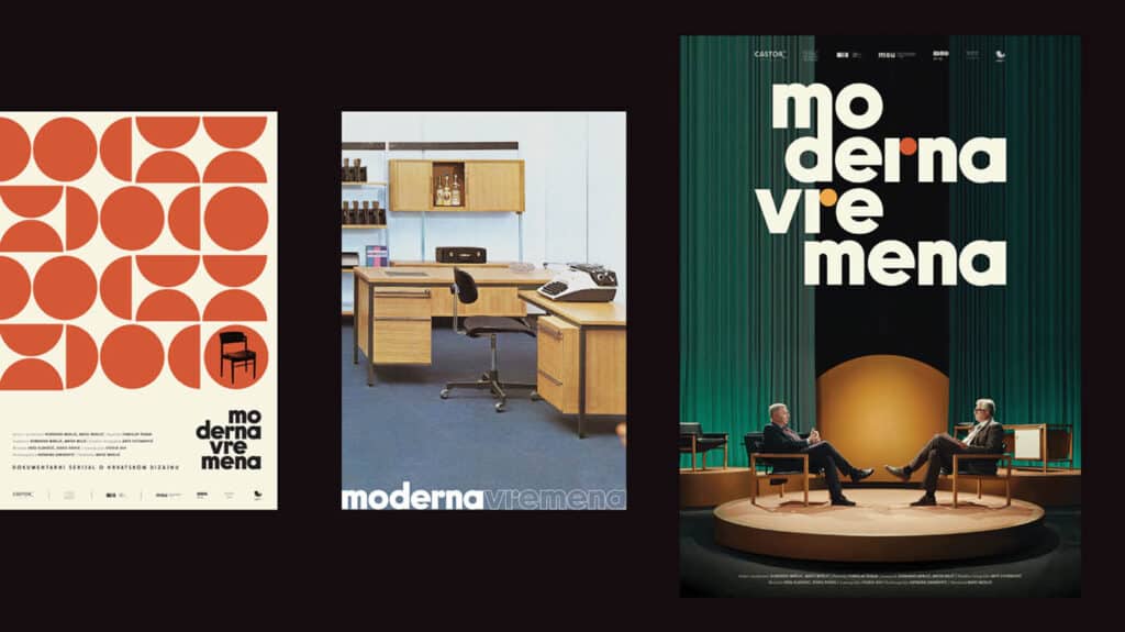 The documentary series Moderna vremena explores key moments in Croatian design history since 1950. Its visual identity, embracing both tradition and modernity, draws inspiration from the simple geometric forms, typography, and visual language of the 1960s, to which the series itself pays special attention. The design is modular, with a color palette matching the set design. Numerous graphic elements (captions, infographics, title sequences, posters, etc.) have been carefully crafted, with the animated opening title sequence standing out. In this sequence, the leitmotif of a playful dot symbolically transforms the concepts of creation and serial production into the main series’ logo.