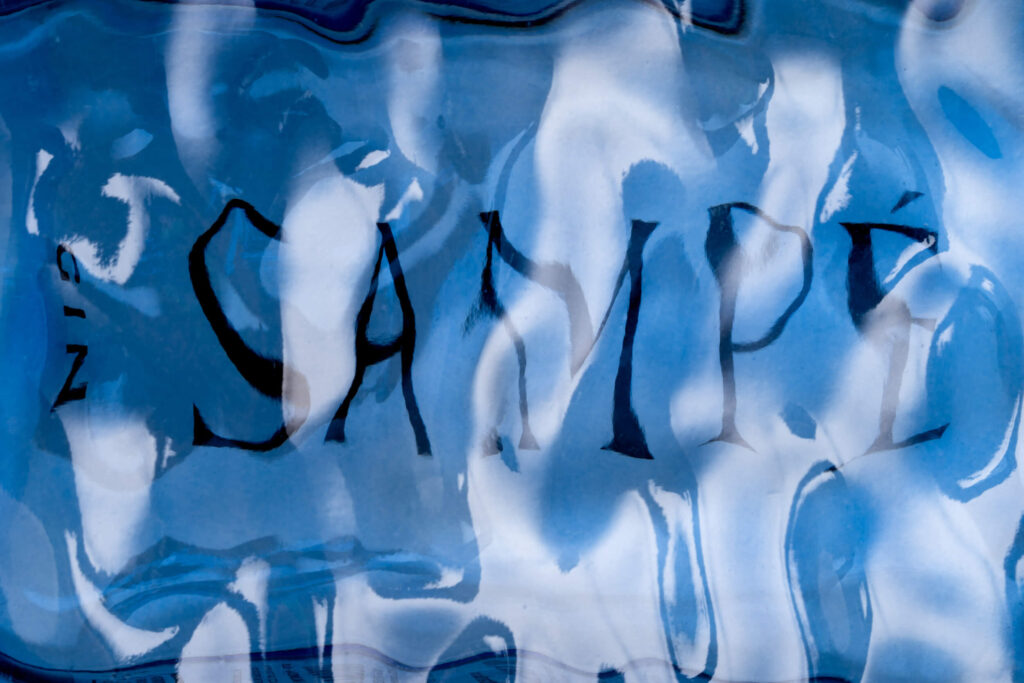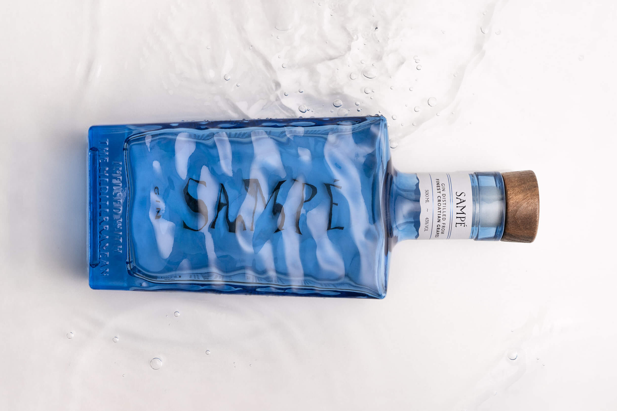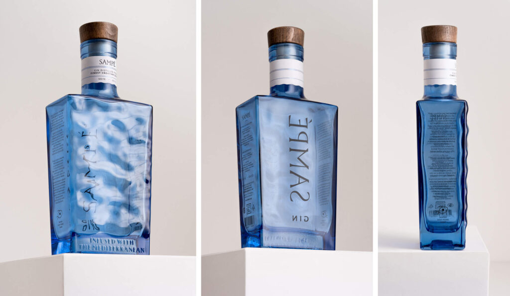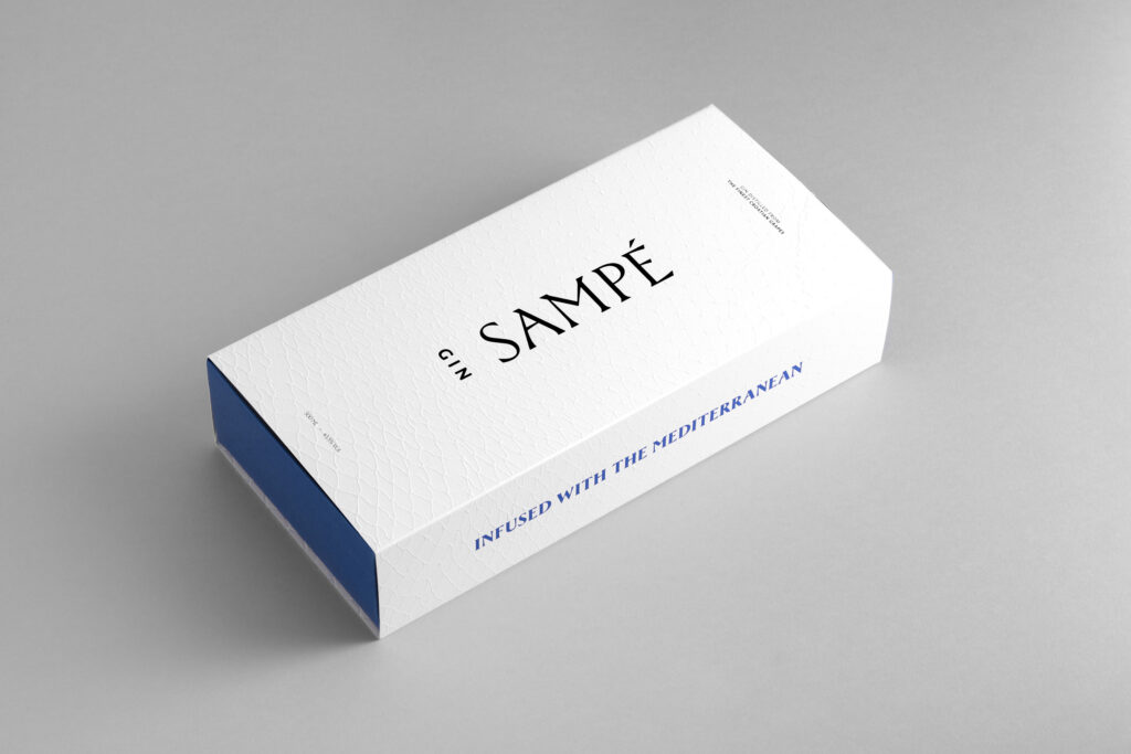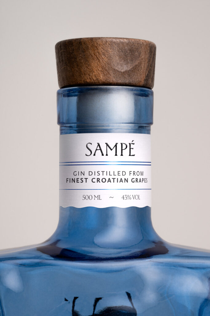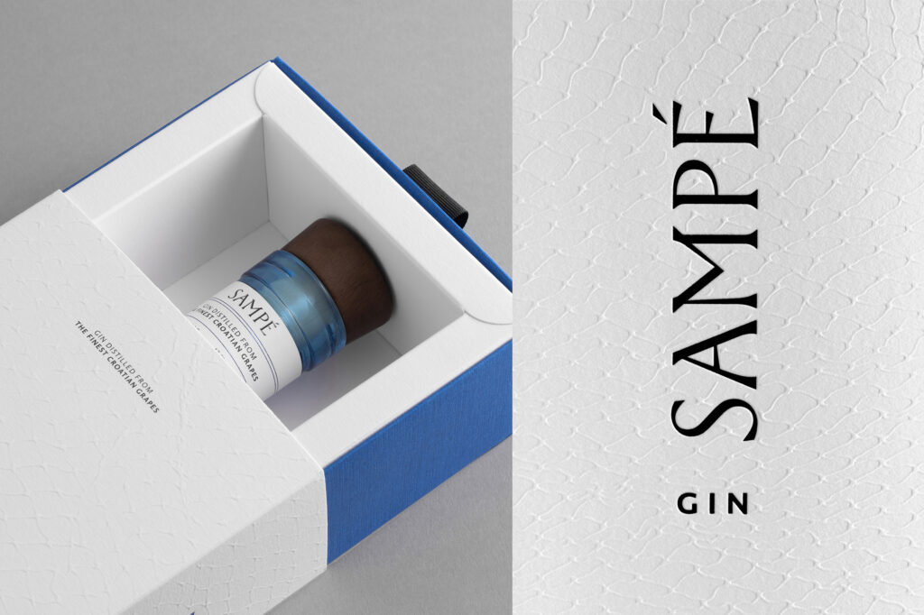 A strong alcoholic drink distilled in Croatia from the finest grapes, with herbal aromas of pine, lemon and Adriatic salt, and deeply connected to the sea. The design of this gin is inspired by the legend of St. Peter and the John Dory fish, also known as Sant-Pierre or Sampé. The original designed bottle has a sea surface texture, with the brand name mirror printed on the back. This position makes the name Sampé appear underwater, deforming the typography and creating exciting shapes by changing the viewing angle. The light blue glass and conical wooden stopper of the sailor’s cap contribute to the Mediterranean atmosphere. A gift box with an embossed fishing net texture increases the exclusivity and protects the bottle.