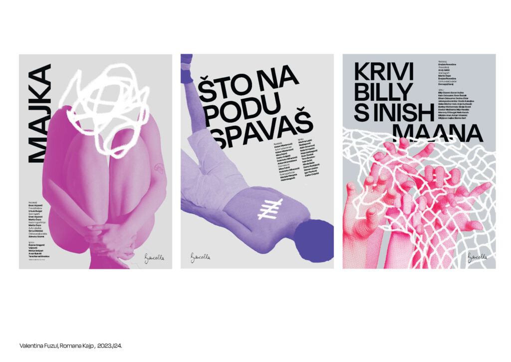 The series of posters for GDK Gavella is designed as a reflection of the interpersonal and subjective states of the characters in selected plays. The posters are created using a combination of hand-drawn motifs and digitally processed photographs, depicting the dehumanization of the characters and their struggle for freedom. In the play Mother, the protagonist transforms into an anonymous figure drowning in psychological madness. Why Are You Sleeping on the Floor portrays a distorted perception of war, where victims are reduced to mere numbers. In The Wrong Billy, the characters attempt to resist in a small community from which there is no escape.
