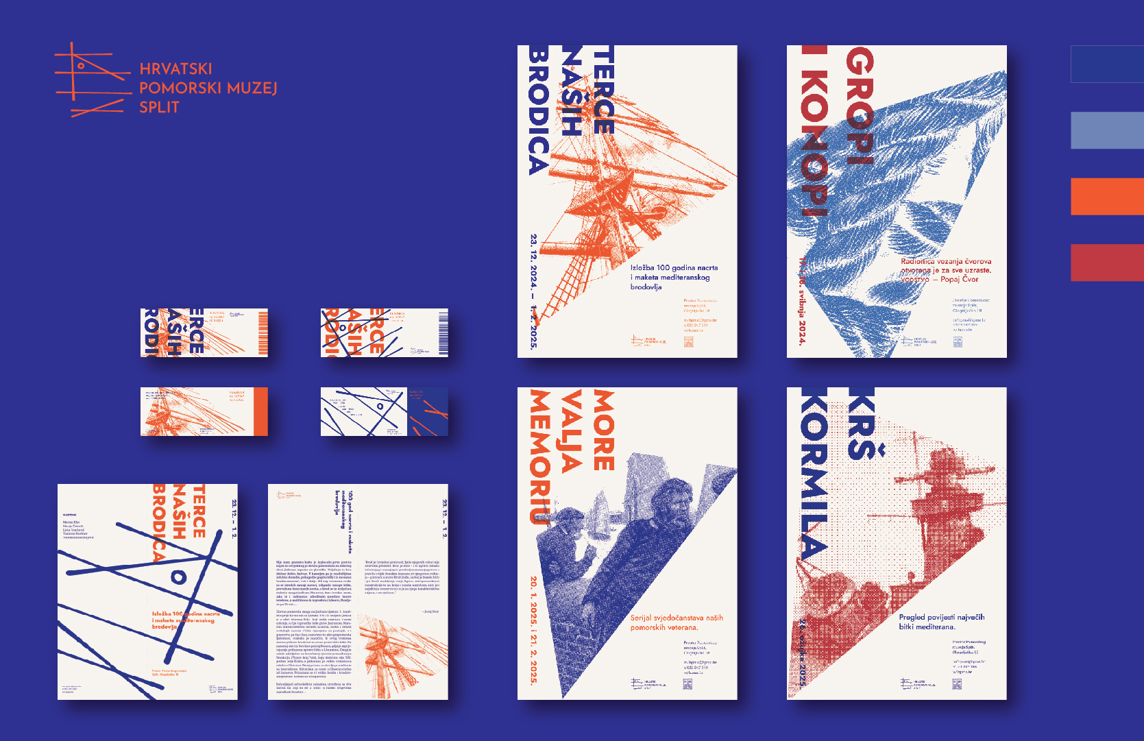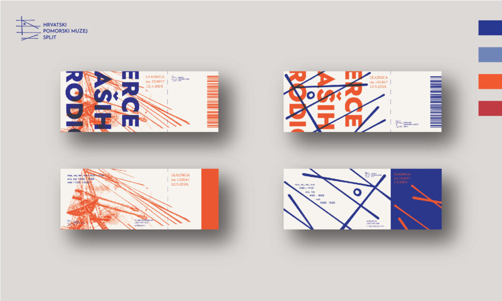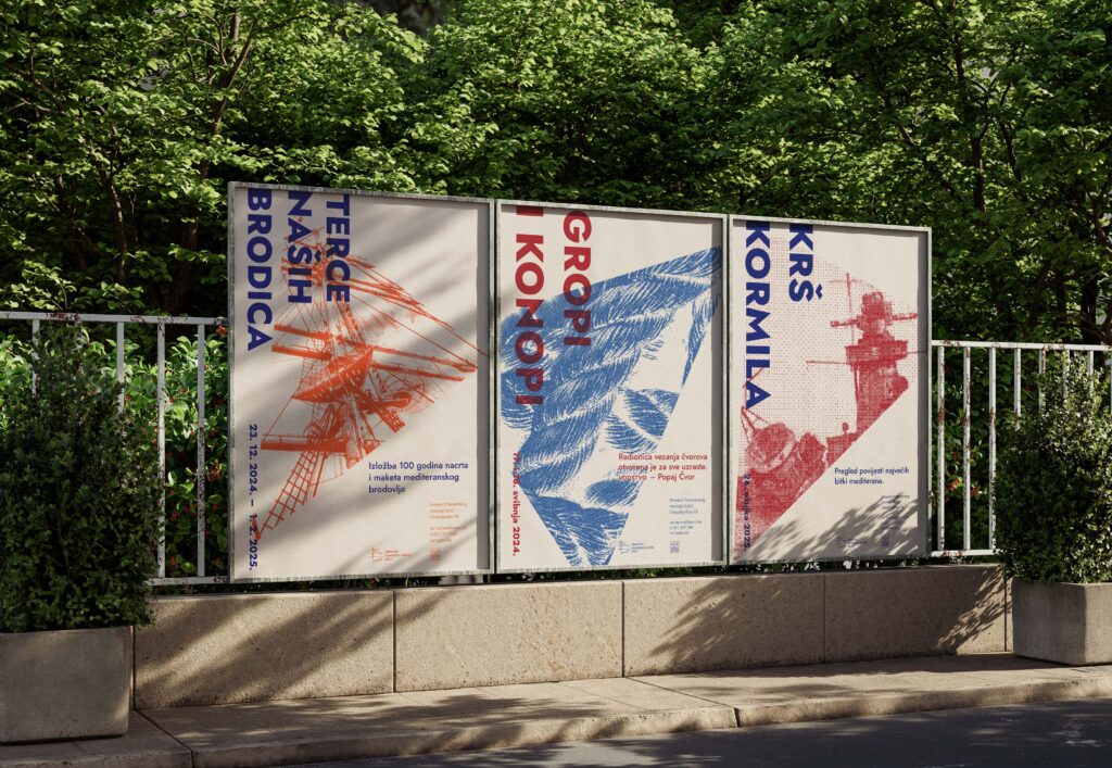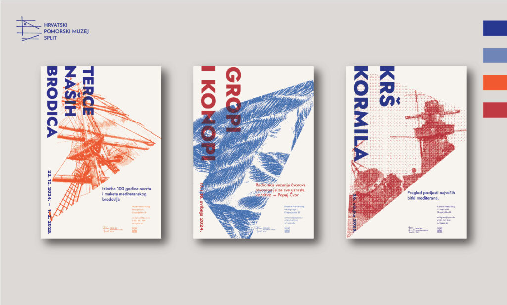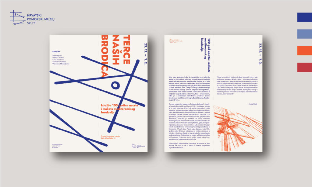 The redesign of the visual identity of HPMS bases itself on the form of the logo and from it derives a system necessary for the development of other visual materials. The side view of the museum’s trademark ship Bakar is linearly reduced to a technical drawing inspired by ship blueprints. A triangle derived from the same solution is used as a movable base for placing the necessary visuals. The choice of colors connects the vibrancy of the Mediterranean with the maritime tradition.