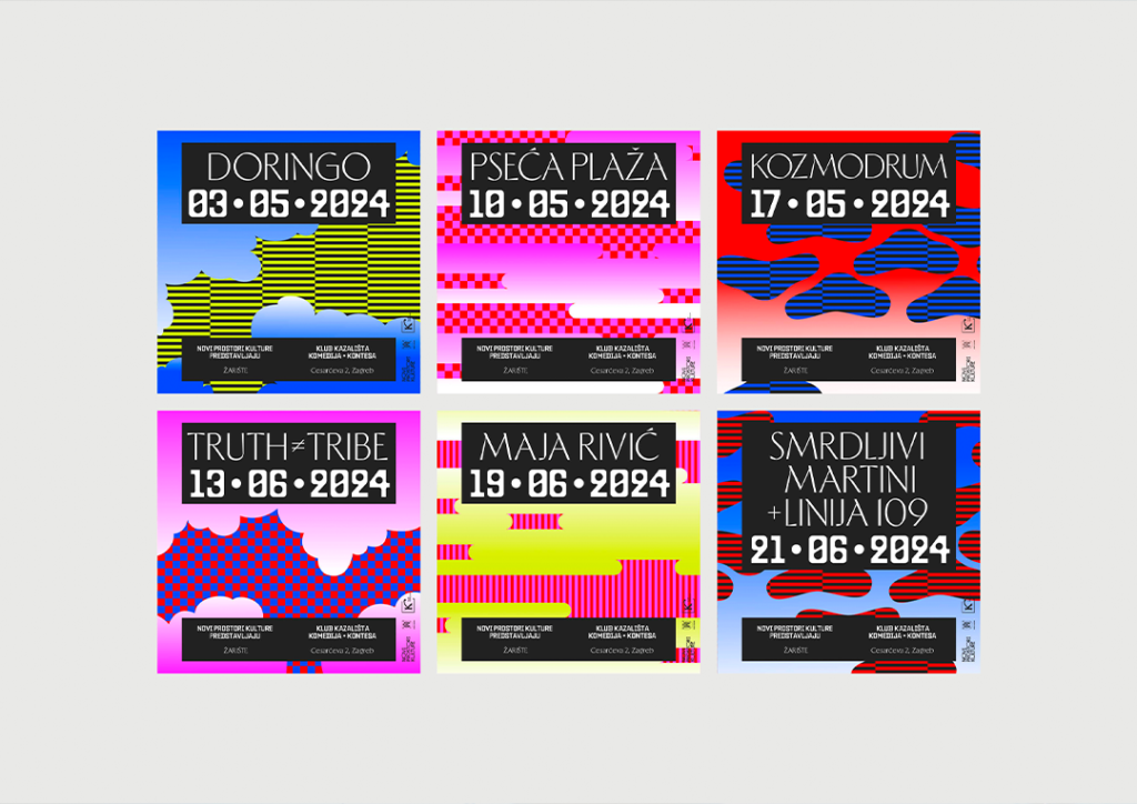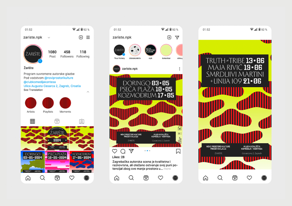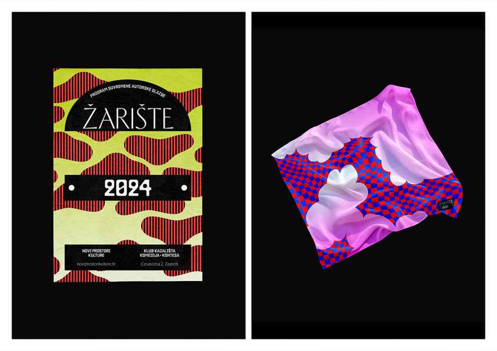 In collaboration with Center for cultural and social development New Cultural Spaces, the visual identity for the Žarište: contemporary author music program was crafted. The program aims to support the scene, provide professional working conditions for authors, and offer a space where audiences can discover and strengthen emerging musical talents. The program is taking place at Kontesa, a venue long synonymous with cabaret. The visual identity merges cabaret and art deco elements with those of alternative music. A playful, dynamic design system was designed to work seamlessly in both digital and print environments.