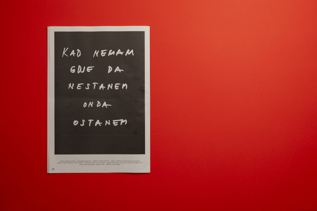 On the occasion of the exhibition of the artist Zoran Pavelić at the Rijeka Museum of Modern and Contemporary Art (MMSU), a newspaper was published that showcases an experimental approach to artistic communication. In addition to the interview with the artist, the newspaper contains a series of works based on textual structures. This approach enables different layered readings and encourages the reader to actively participate in the interpretation of the work of art. Each text fragment represents a kind of invitation to reflection and opens space for personal interpretation. In this way, the newspaper becomes an independent work as well as an integral part of the exhibition.