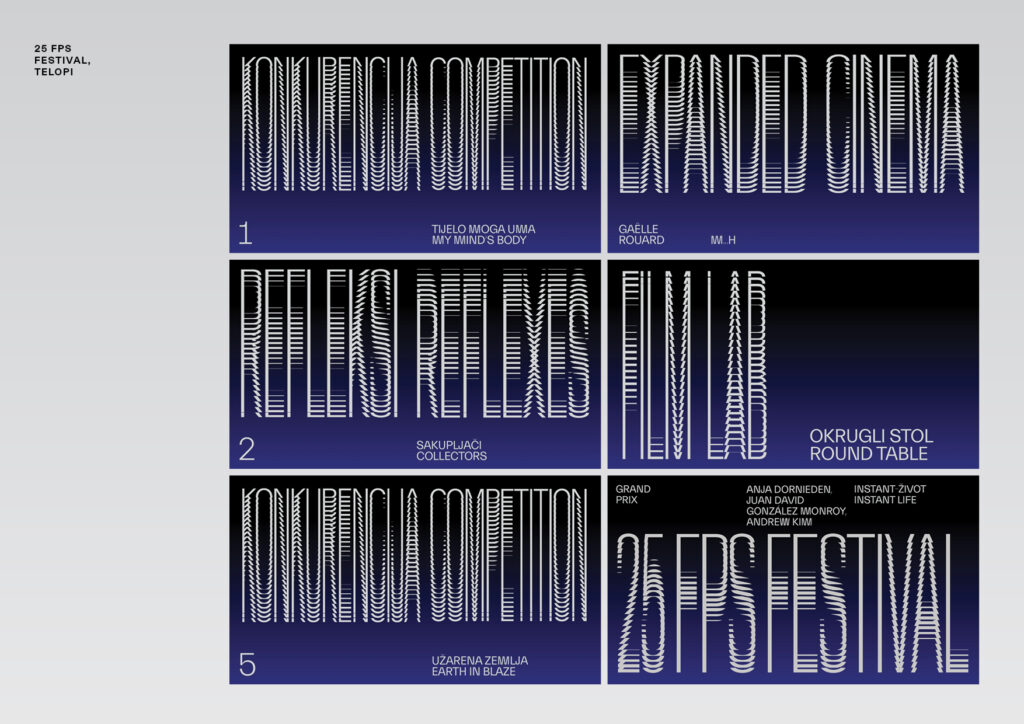 Vizualni identitet 18. internacionalnog festivala eksperimentalnog filma i videa 25 FPS je inicijalno osmišljan kao komplementarni par prethodnom vizualnom identitetu festivala i zasniva se na multiplikaciji slovnih segmenata, transformirajući logotip u ilustraciju. Minimalistički koncept inspiriran je specifičnostima pokretne slike, analogne filmske vrpce i njenim mehaničkim manipulacijama. Tipografski tretman naziva festivala tako postaje varijabilni grafički vizual prema čijem principu je moguće oblikovati različite vrste informacija u različitim proporcijama i formatima.