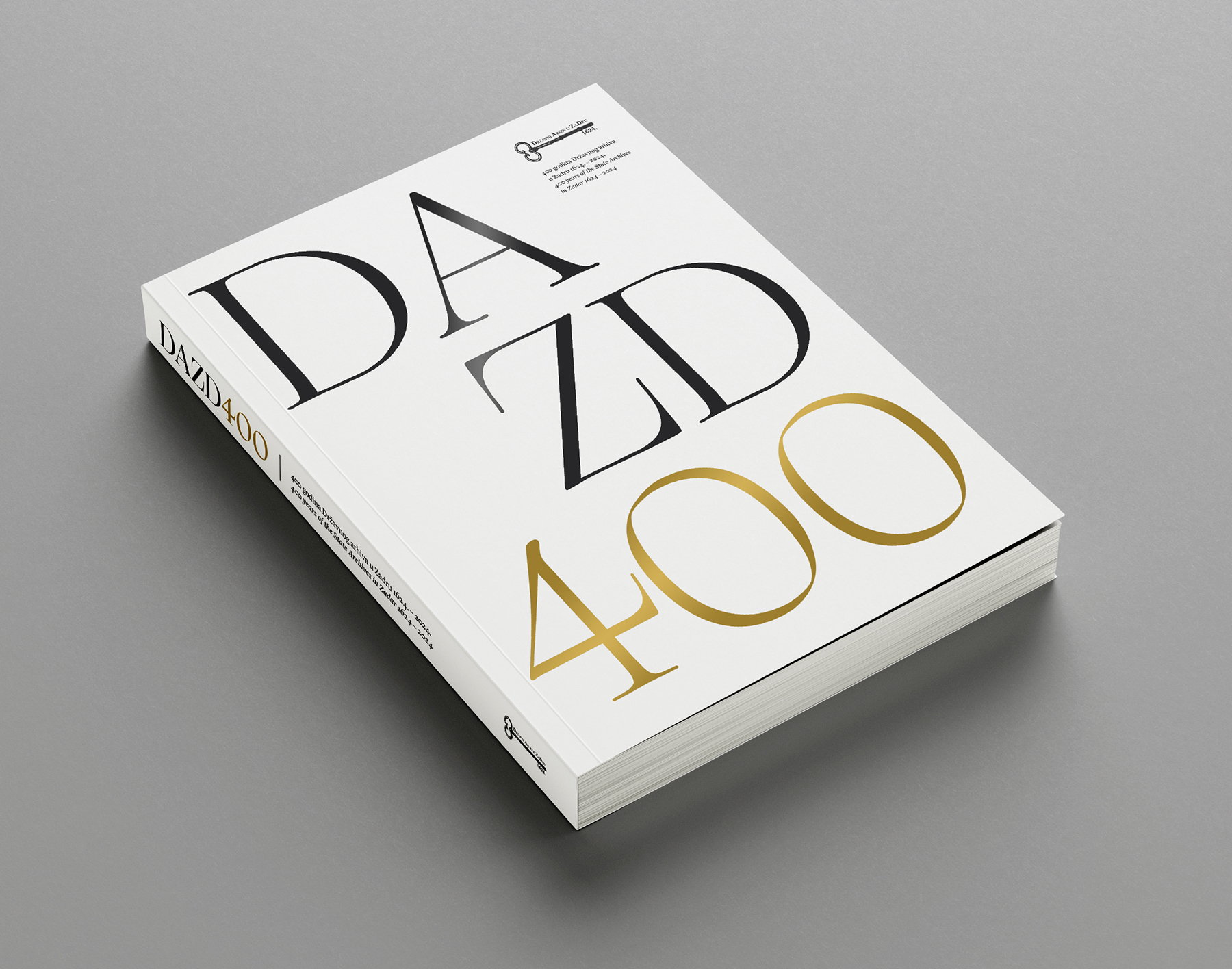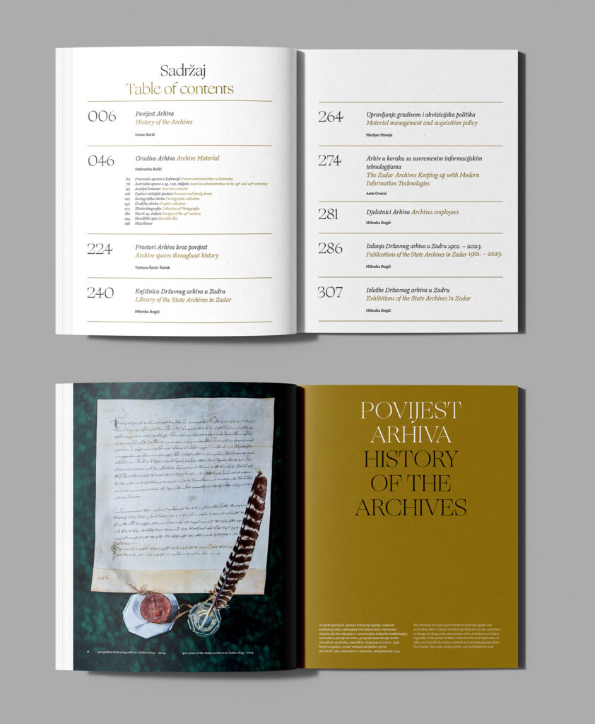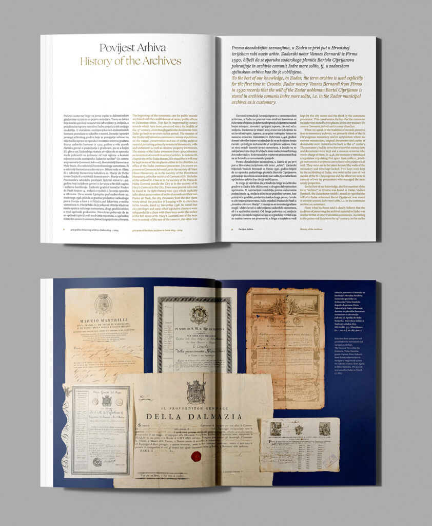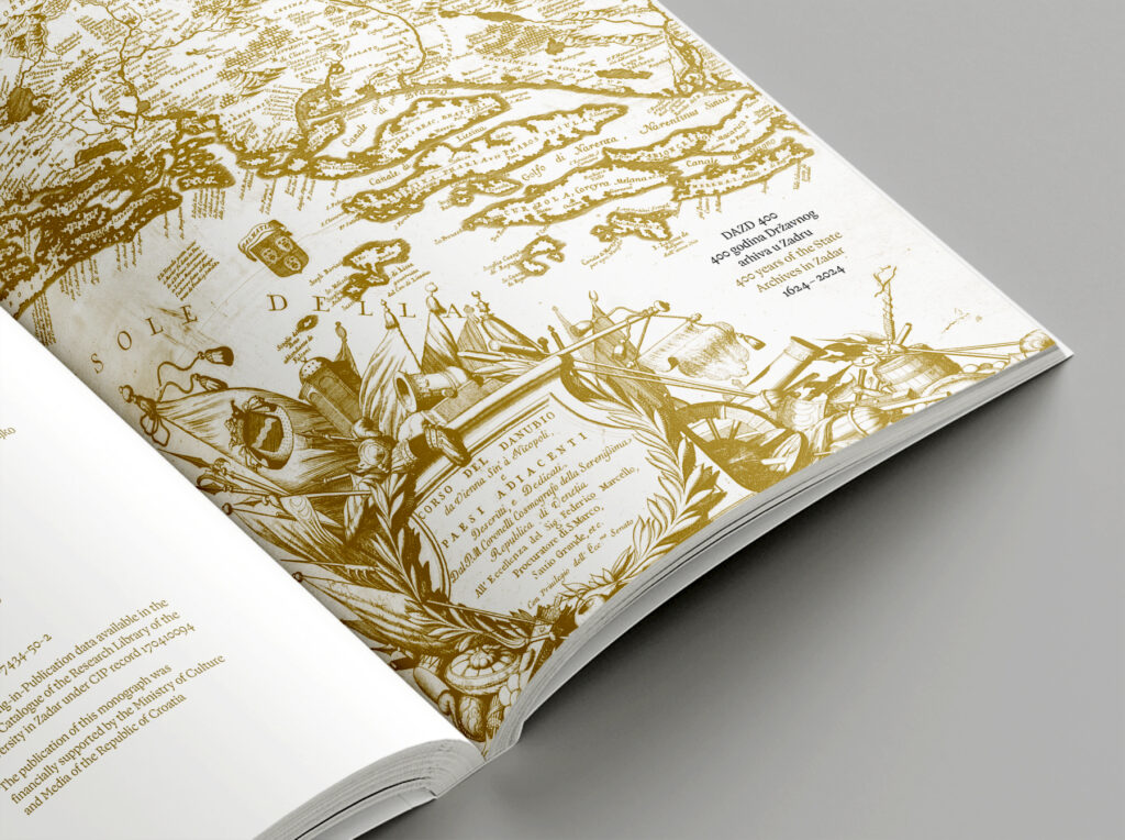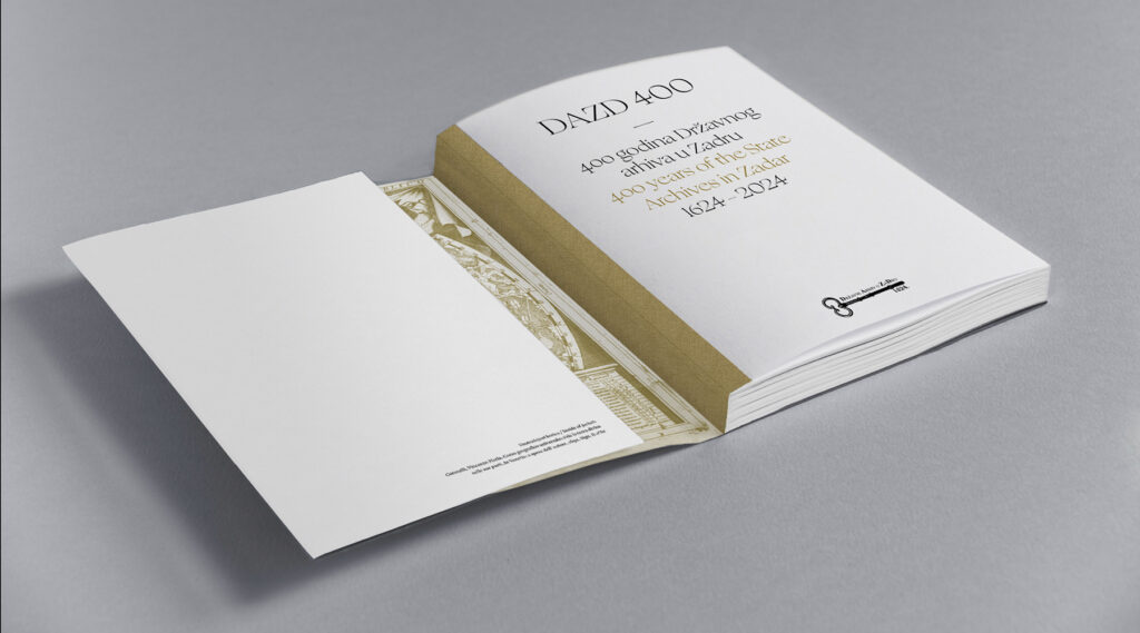 Državni arhiv u Zadru osnovan je davne 1624. u doba mletačke vlasti u Dalmaciji. U sklopu obilježavanja ove značajne obljetnice, arhiv je odlučio izdati monografiju koja daje uvid u povijest, građu i djelovanje arhiva kroz četiri stoljeća njegovog postojanja. Uz publikaciju, postojeći identitet arhiva nadopunjen je novim obljetničkim ruhom, uz popratne tiskovine. Tipografsko rješenje inspirirano je rukopisnom građom arhiva, balansirajući između povijesnog i suvremenog, uz minimalistički pristup pri oblikovanju, kako bi bogata građa arhiva zasjala u punom sjaju.