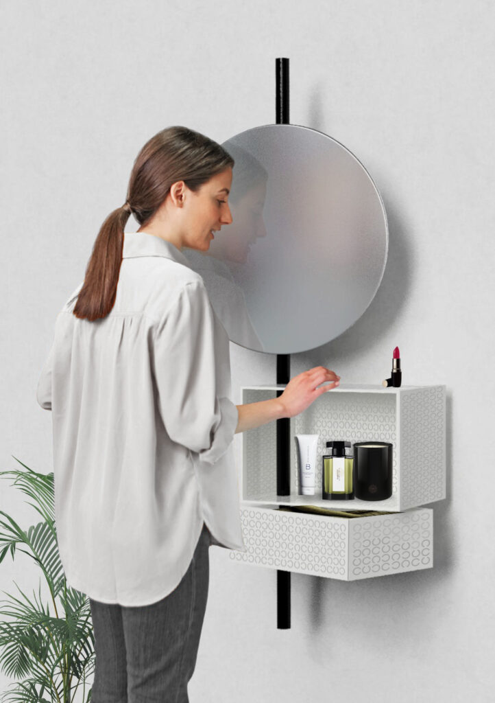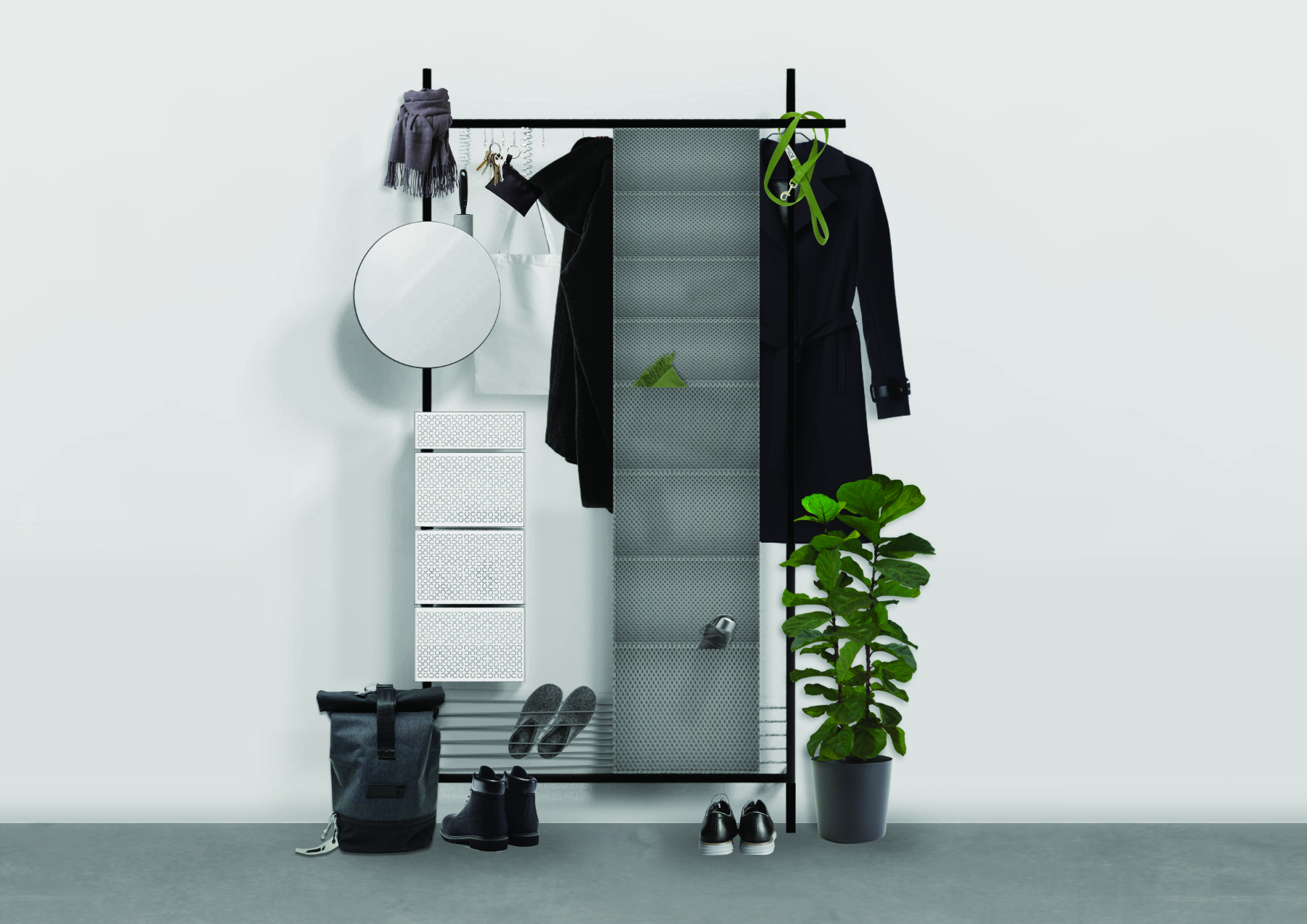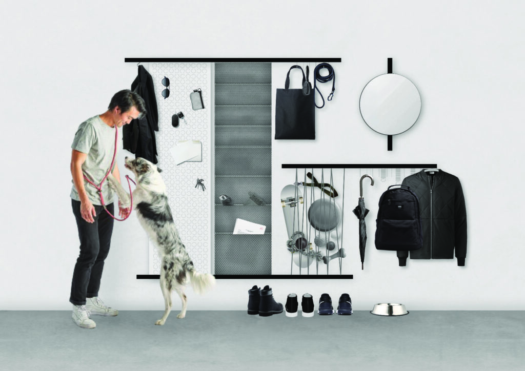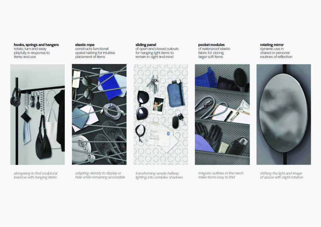 Flux je modularni sustav za privremeno skladištenje u predsoblju i drugdje — inspiriran pokretom scenografije. Riječ „foaje“ potječe iz kazališta — kao prostorija u kojoj glumci odmaraju prije izlaska na pozornicu. Hodnik je ispunjen kostimima i rekvizitima za vanjski svijet, te postaje scenografija transformacije ulaska i izlaska iz doma. Flux se prilagođava svim prostornim kontekstima i potrebama prolaska, istražujući intuitivne koreografske rutine ulaznih prostora. Kao dinamičan mobil visećih i skladišnih elemenata, oživljava kretanje i interakciju u često zanemarenom hodniku — suptilnom igrom materijala, kretnji, otvorenosti, vidljivosti, taktilnosti, svjetla i sjene.