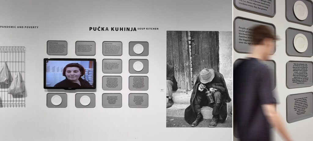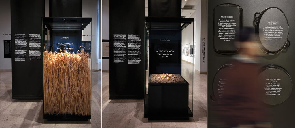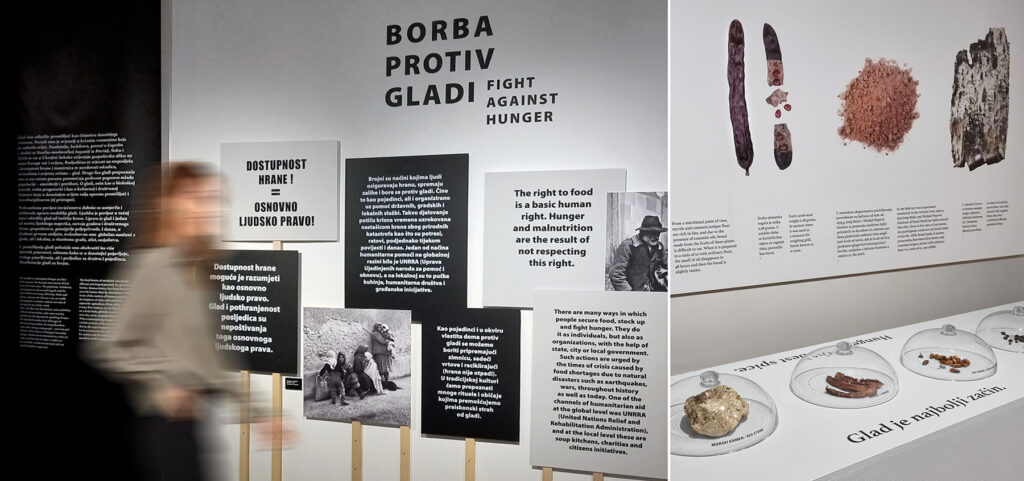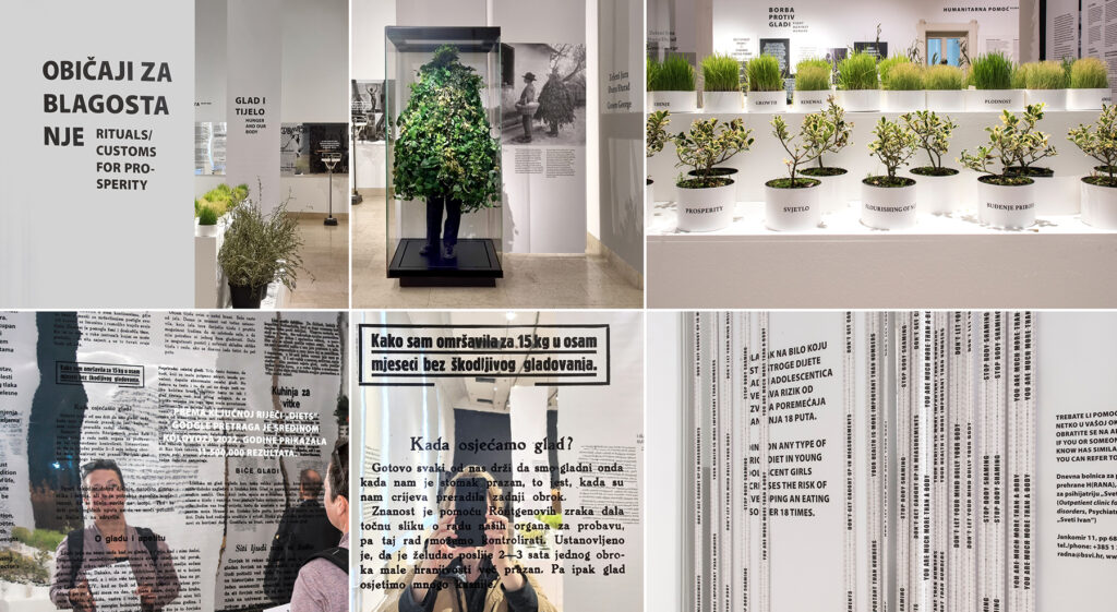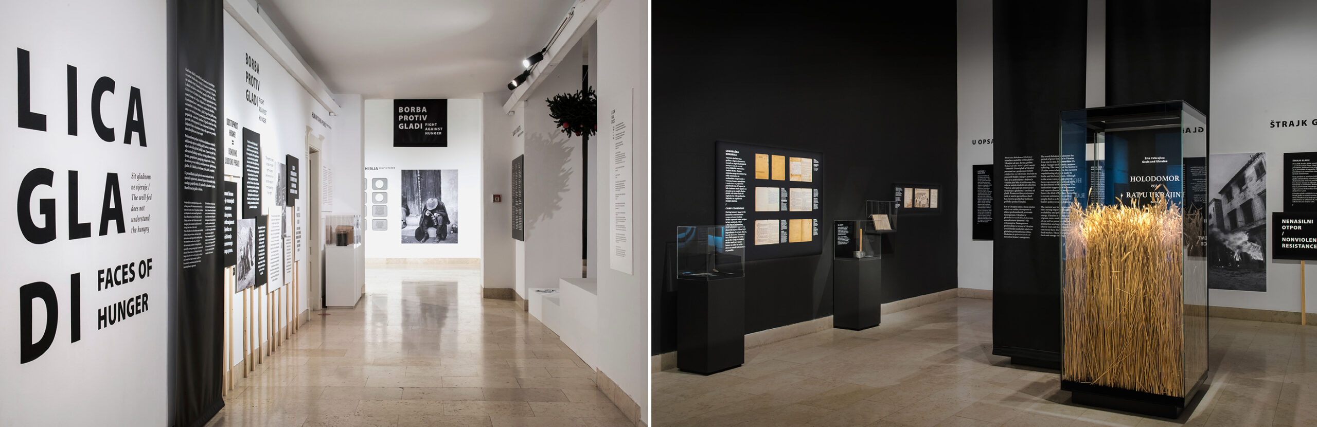 Izložba EMZ-a Lica gladi” istražuje načine na koje su se ljudi kroz povijest borili protiv gladi. Ova izložba analizira glad kao političko sredstvo manipulacije masama i kao oblik otpora. Posebna pažnja posvećena je temama poput tijela i samonametnute gladi. Kustosice su odabrale predstaviti teme koristeći ograničen broj predmeta i fotografija, što je u oblikovanju rezultiralo stvaranjem specifičnih interpretacijskih instalacija kako bi se zahtjevne teme približile široj publici. Vizualno, izložba je podijeljena na crni i bijeli segment. Kroz ovaj kontrast izložba priča priču o gladi koja, osim što razotkriva mračnu stranu ljudske prirode, donosi i svijetlu priču o solidarnosti i humanizmu.