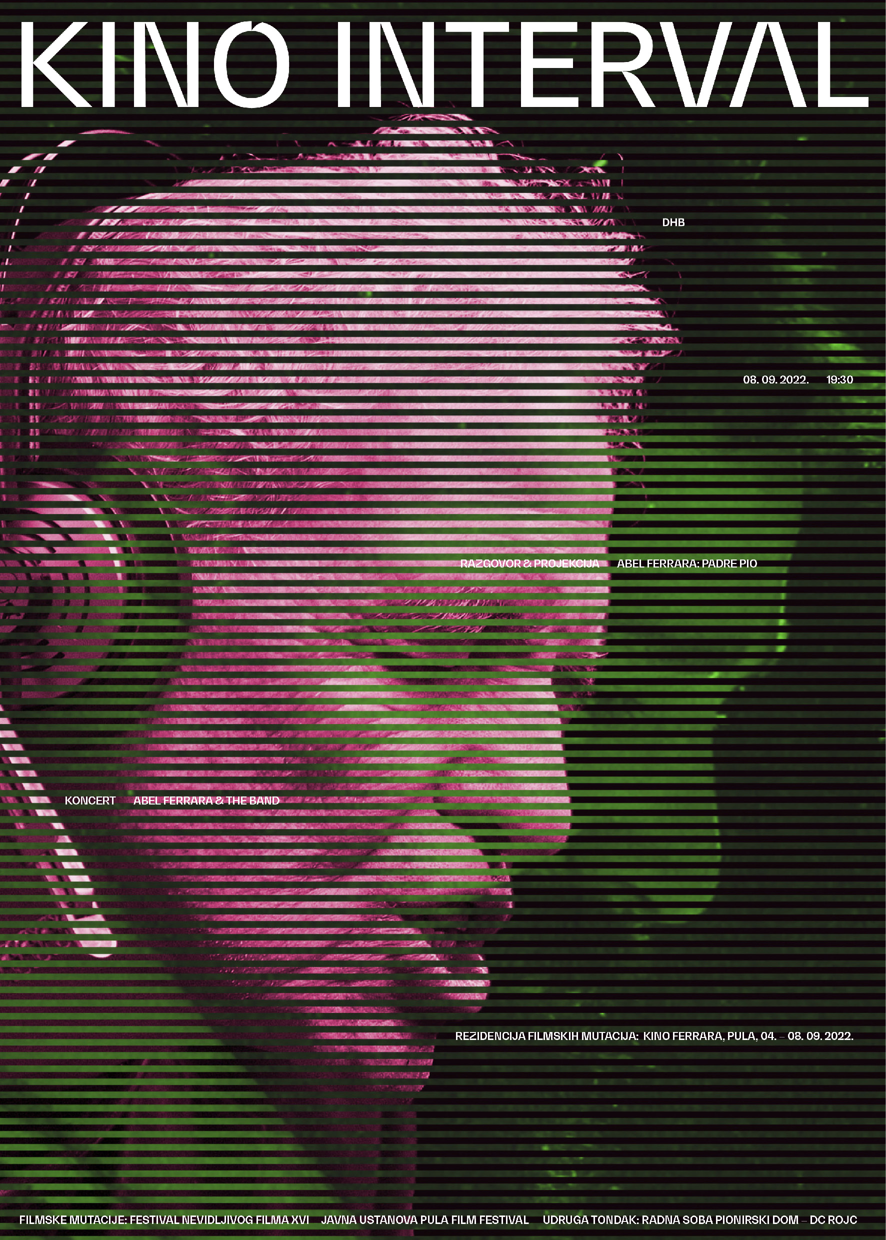 Dizajnirajući promotivne materijale za Kino Interval, filmsko i glazbeno zbivanje u Puli u organizaciji Filmskih mutacija – festivala nevidljivog filma, cilj je bio prikazati Abela Ferraru u različitim životnim ulogama, ističući njegov slojevit autorski karakter. Događanje je obuhvatilo projekciju Ferrarinog značajnog filma Padre Pio te koncert njegova sastava Abel Ferrara and the Band. Vizualni identitet događanja osmišljen je kroz isprepletene linijske intervale, koji spajaju Ferraru s koncerta s glavnim likom njegovog filma, stvarajući novu, zbrojenu sliku. Ovaj pristup vizualno oslikava povezanost Ferrarina filmskog i glazbenog izraza.