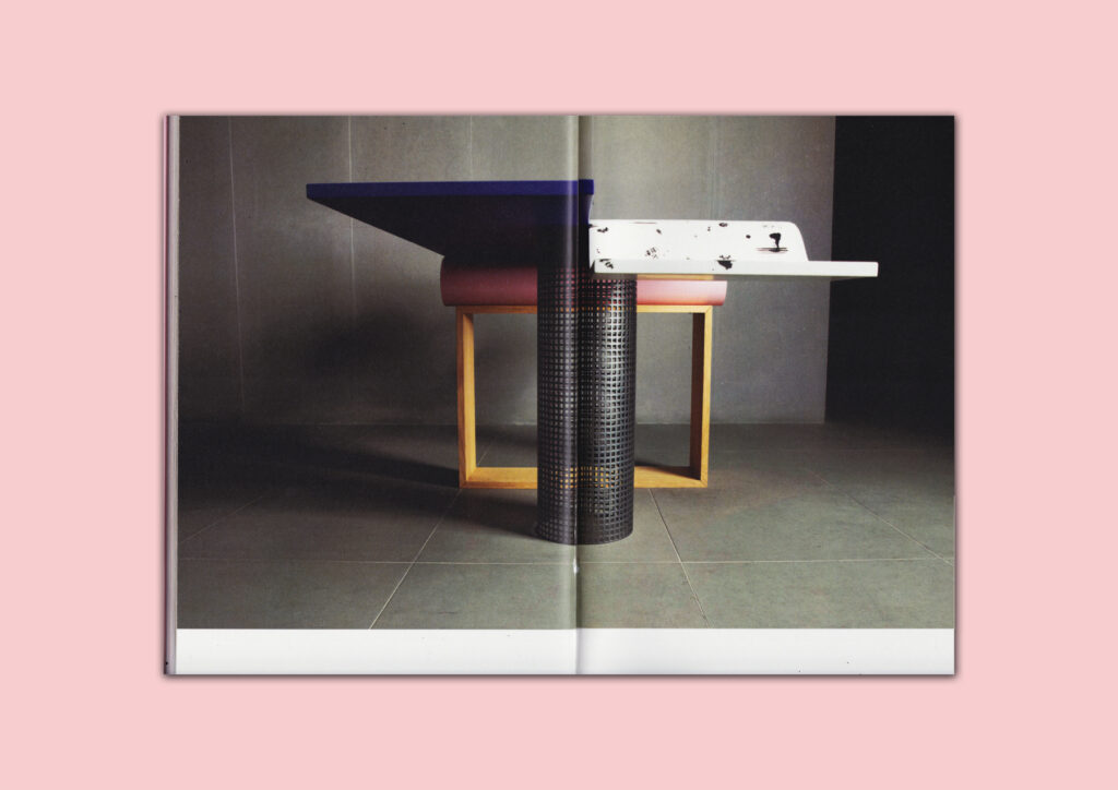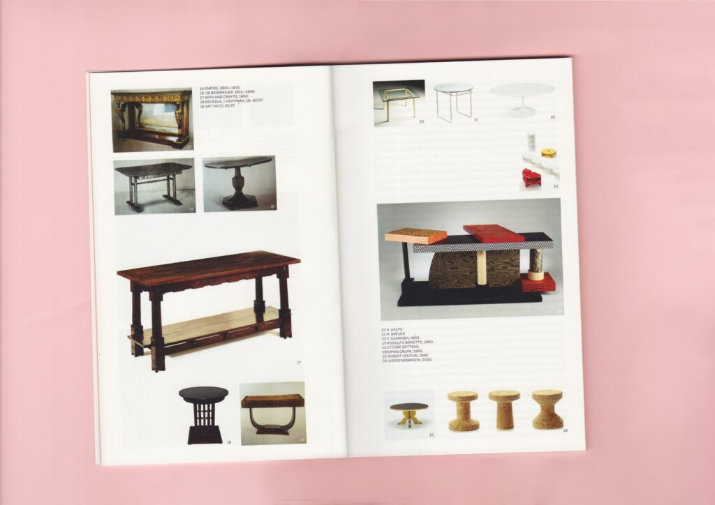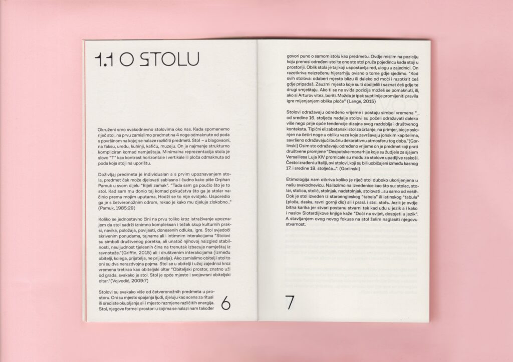 Knjiga Stol kao mjesto/No place like table Ene Čuček oblikovana je kao ekstenzija njenog diplomskog rada u drugom mediju. Stol, koji je između funkcionalnog i umjetničkog objekta, prati knjiga temeljitog istraživanja, koja se i sama nastoji smjestiti na sjecištu te dvije uloge. Oblikovni jezik nadograđen je u dvodimenzionalnom prostoru grafičkim elementima boje i tipografije. Spoj zaobljenih i ravnih ploha stola, sličnog razigranog karaktera, pronađen je u pismu korištenom za naslove. Blokovi kontinuiranog teksta su uredni i funkcionalni, dok su otvaranja poglavlja, kao i odabrani citati, slobodni unutar stranica na kojima pronalaze vlastiti prostor i formu.