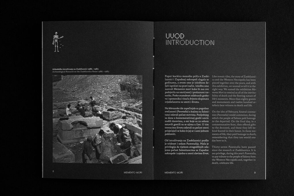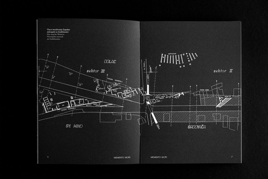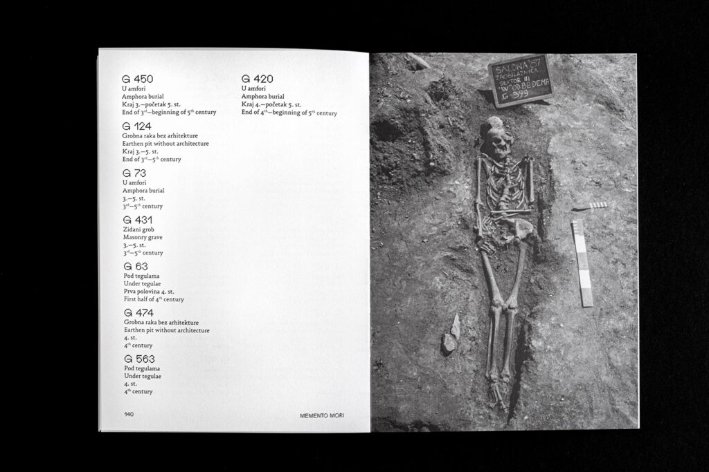 Vodič izložbe Memento Mori prikazuje arheološka istraživanja salonitanske zapadne nekropole provedena 1986.-1987. zbog gradnje tzv. solinske zaobilaznice. Arheolozi koji su radili na ovim istraživanjima bezuspješno su upozoravali na kulturocid te su unutar 13 mjeseci morali ubrzano istražiti i spasiti iznimno vrijedne predmete sadržane u grobnicama. Ostaci antičkih spomenika i grobova otkrili su tajne života antičke metropole – Salone. Ovaj vodič istovremeno priča priču o kulturnim vrijednostima pojedinih eksponata koje je umalo prekrio crni asfalt – odakle proizlazi inspiracija za boju identiteta. Duhovite ilustracije prenose vedro shvaćanje zagrobnog života svojstveno Rimljanima.