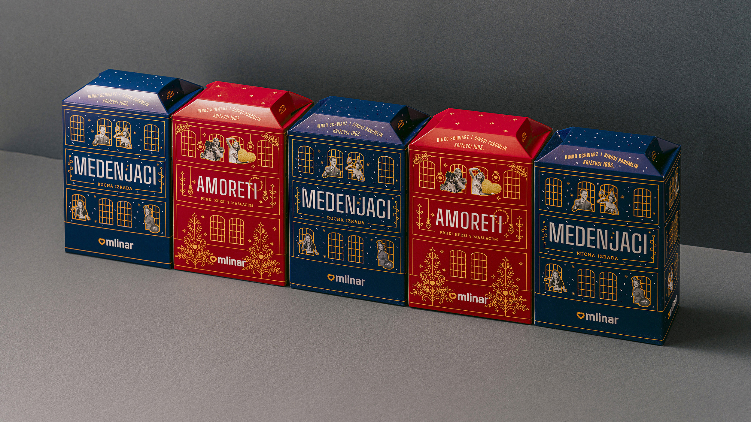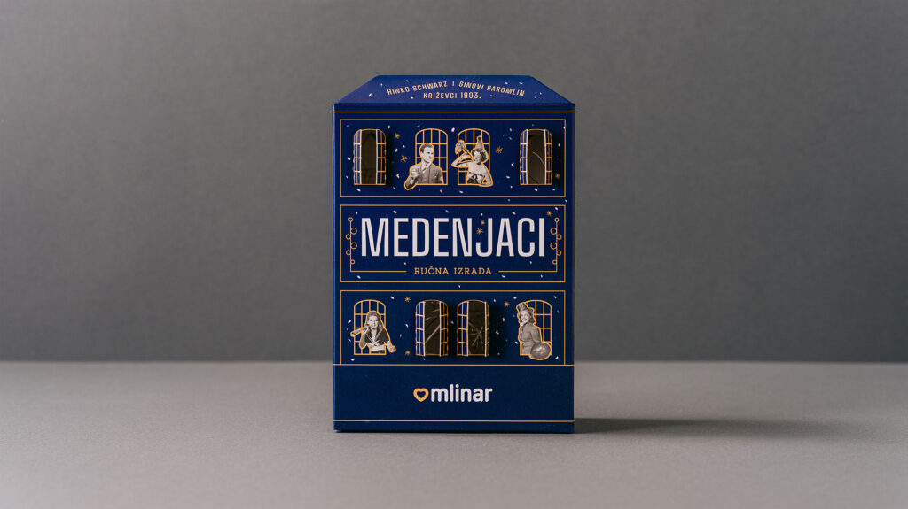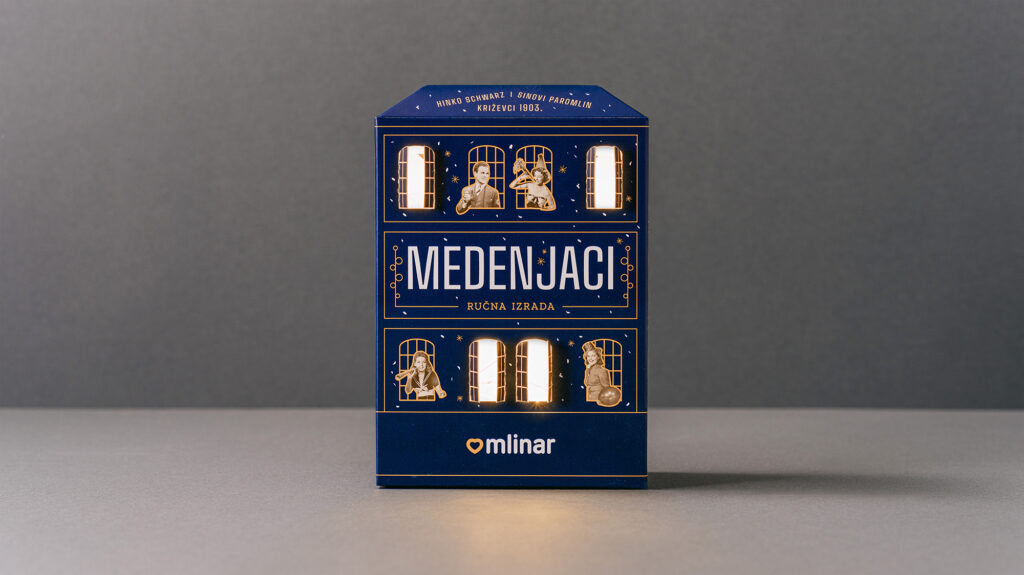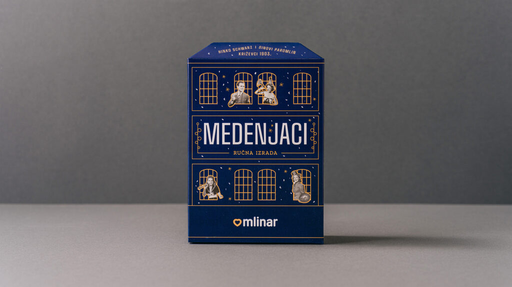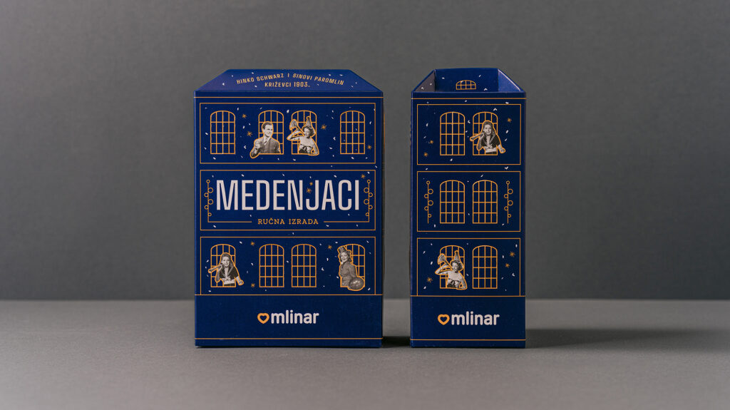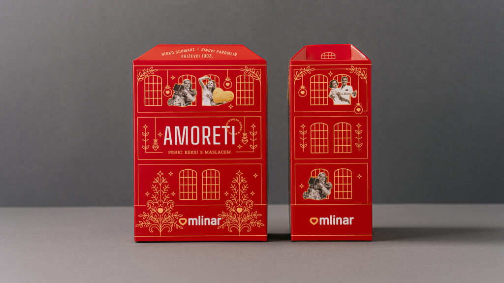 Zadatak je bio osmisliti novi dizajn ambalaže za božićnu limitiranu seriju Mlinarovih Medenjaka i Amoreta. Budući da se nova ambalaža radila u godini kada je Mlinar obilježavao 120 godina postojanja, ideja je bila vezati se uz zgradu križevačkog Paromlina koji je davne 1903. osnovao Hinko Schwartz. Inspiracija za dizajn kutije pronađena je u obliku i prepoznatljivim vizualnim karakteristikama izvorne zgrade križevačkog Paromlina. Pakiranje je obogaćeno blagdanskim motivima. Kutija je interaktivna jer joj se mogu otvarati prozori, koji su u božićno doba bili dodatno osvijetljeni božićnim lampicama.Kutija se koristila u Mlinarovim poslovnicama kao dio božićnog uređenja izloga.