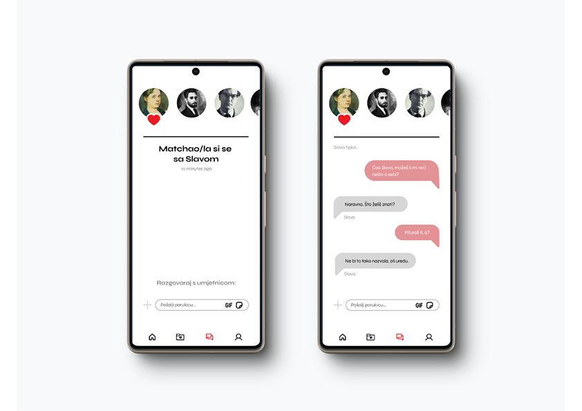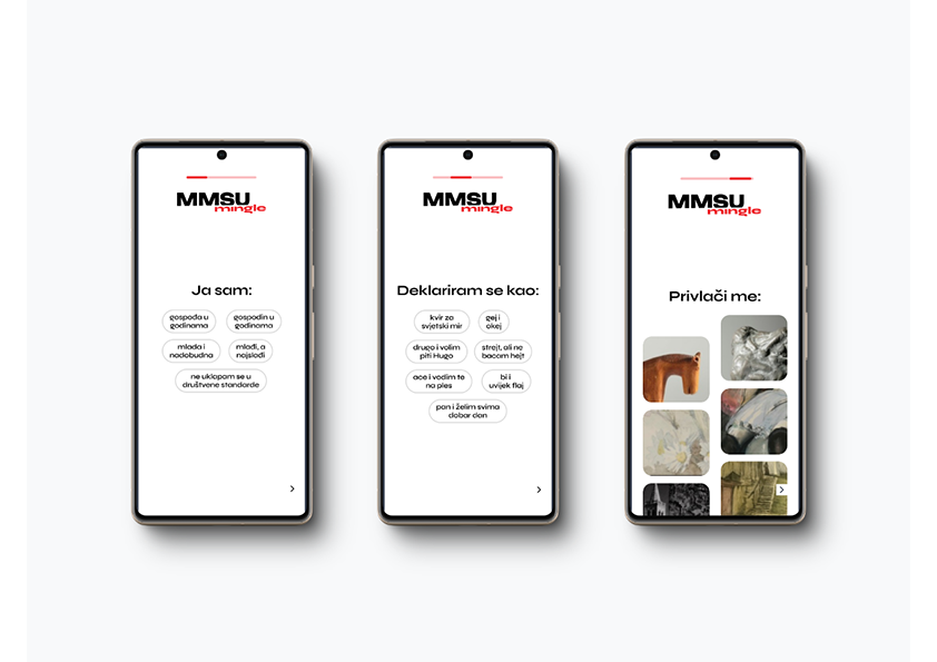 Muzej moderne i suvremene umjetnosti u Rijeci ima veliku arhivu koju nije moguće fizički prikazati. U sklopu kolegija Dizajn interaktivnih medija II, tim je osmislio MMSU Mingle, mobilnu aplikaciju koja spaja umjetnost i dejting. MMSU Mingle cilja na privlačenje mladih, omogućujući korisnicima da biraju umjetnike i radove, prilagođavaju profile, favoriziraju omiljene umjetnike i primaju obavijesti o izložbama. Aplikacija omogućuje dopisivanje s umjetnicima iz arhive, naglašavajući personalizaciju i posebnu povezanost.