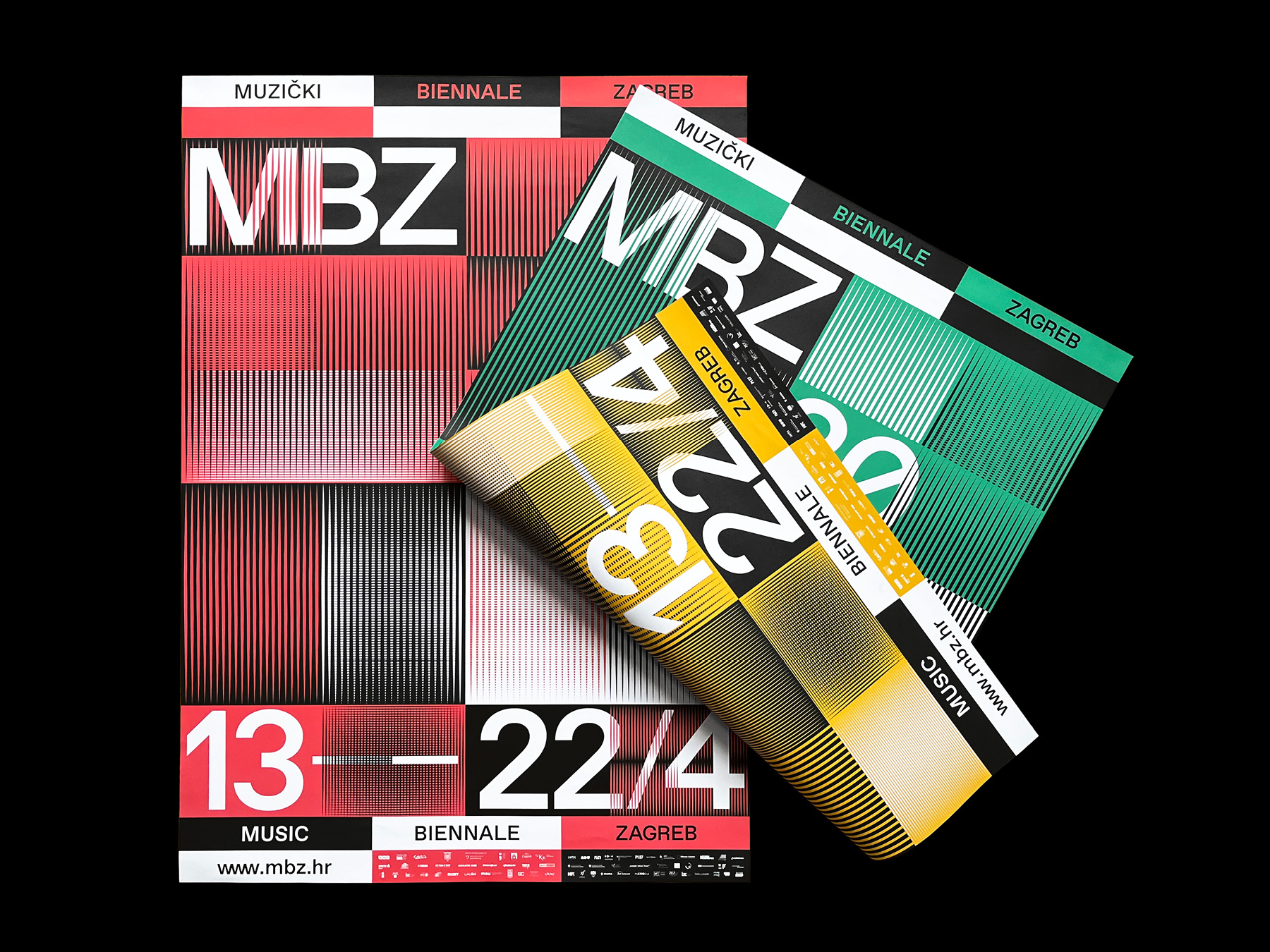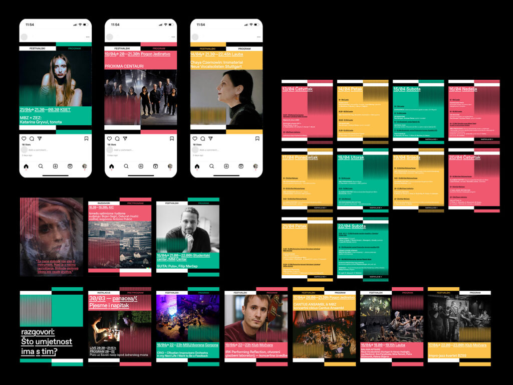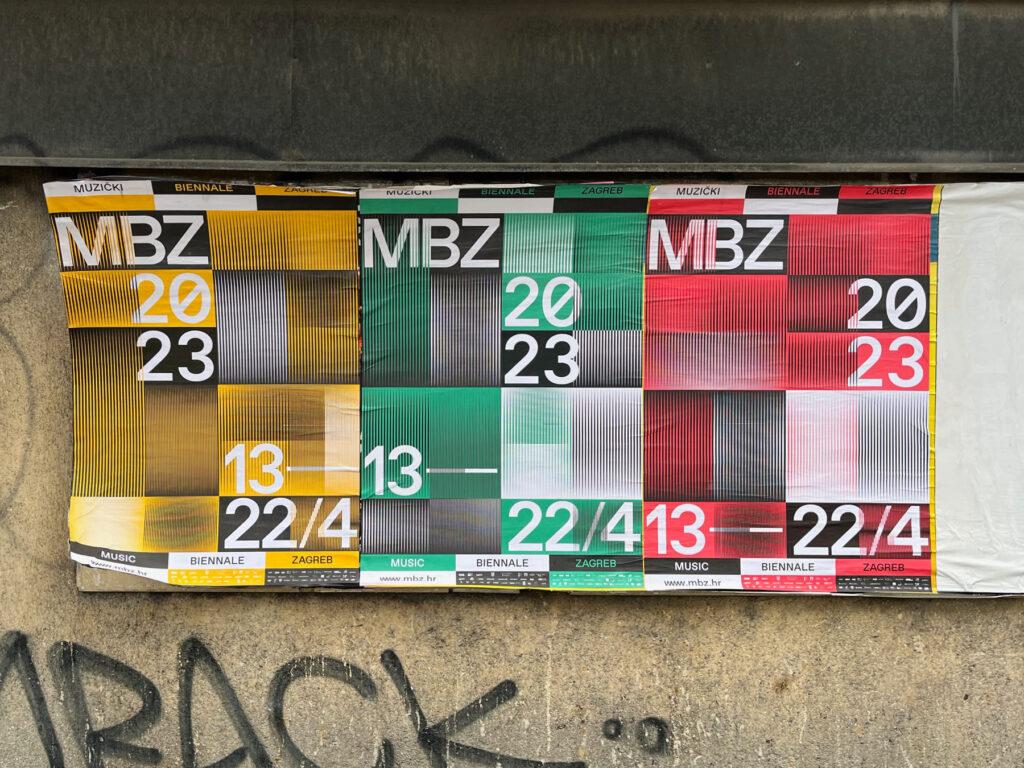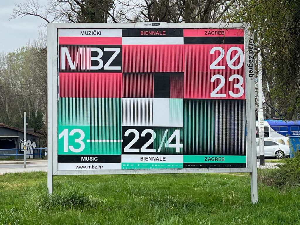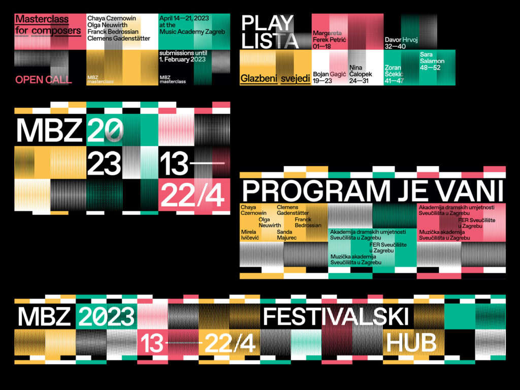 Identitet MBZ 2023 zasniva se na permutacijama linijskog uzorka putem horizontalnog i vertikalnog pomaka, orijentacije, gustoće i korištenja identitetskih (ne)boja. Variranjem parametara po mreži koja je zadana hijerarhijom tipografije stvaraju se vizualne interferencije srodne onima koje čine zvučni valovi. Različita mjerila uzorka prilagođavana su kanalima komunikacije — vizuali za tiskane formate bogatiji su preklopima uzoraka, a animirane varijante njegovim pokretima i zvučnim komponentama. Ovaj je posljednji u nizu tri identiteta koji je autorski tim razvio za MBZ, a koji su ovoj manifestaciji nakon dugo vremena vratili razinu vizualne komunikacije koju je festival povijesno njegovao.