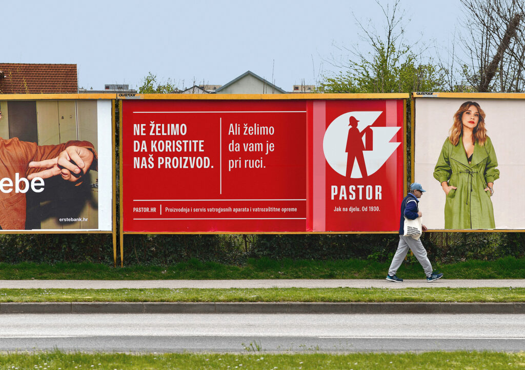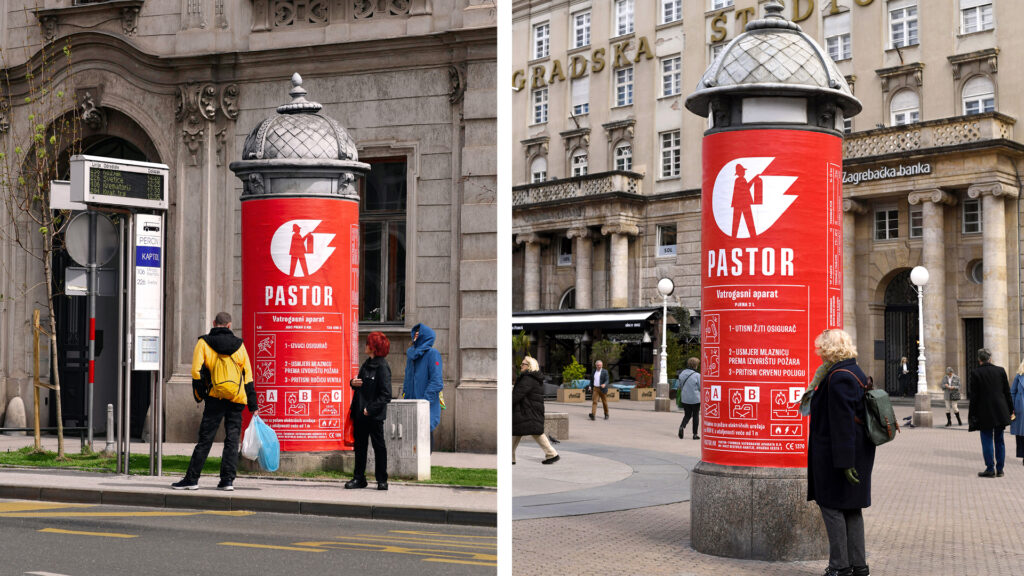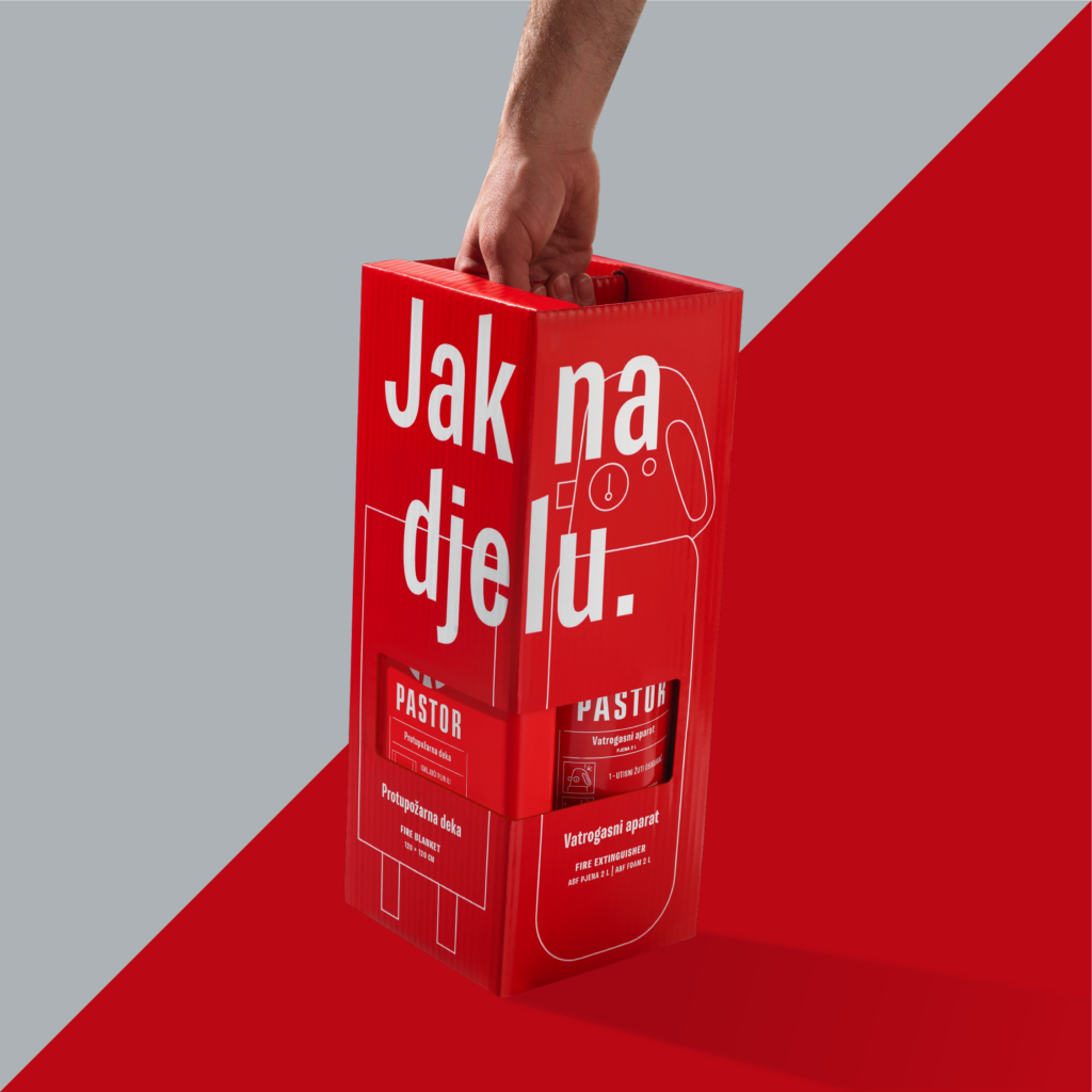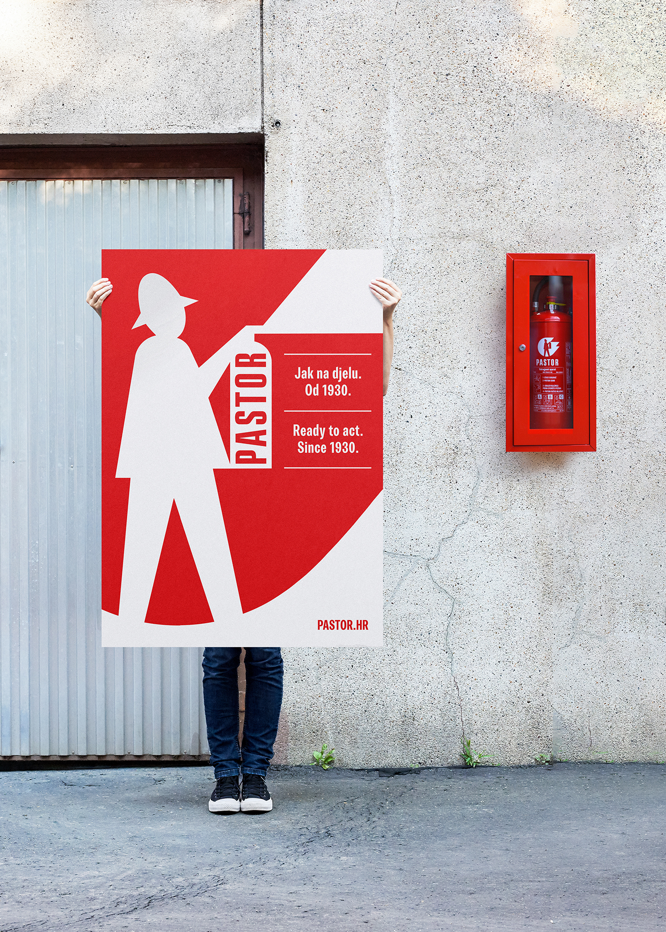 Pastor je hrvatska tvornica s dugom poviješću, koja i danas proizvodi vatrogasne aparate u cijelosti samostalno. Zatečeni vizualni identitet imao je nekoliko snažnih prepoznatljivih elemenata, koji su redizajnom dobili novu oblikovnu kvalitetu i postali okosnica novog koherentnog identitetskog sustava, koji je svuda gdje je bilo moguće malo pomaknuo granice izuzetno strogo i tehnički reguliranog sektora. Za prvu javnu komunikaciju rebrandinga, svježe redizajniranim uvećanim grafikama vatrogasnih aparata oblijepljeni su oglasni stupovi kako bi ih prolaznici mogli u miru proučiti dok nigdje ne gori.
