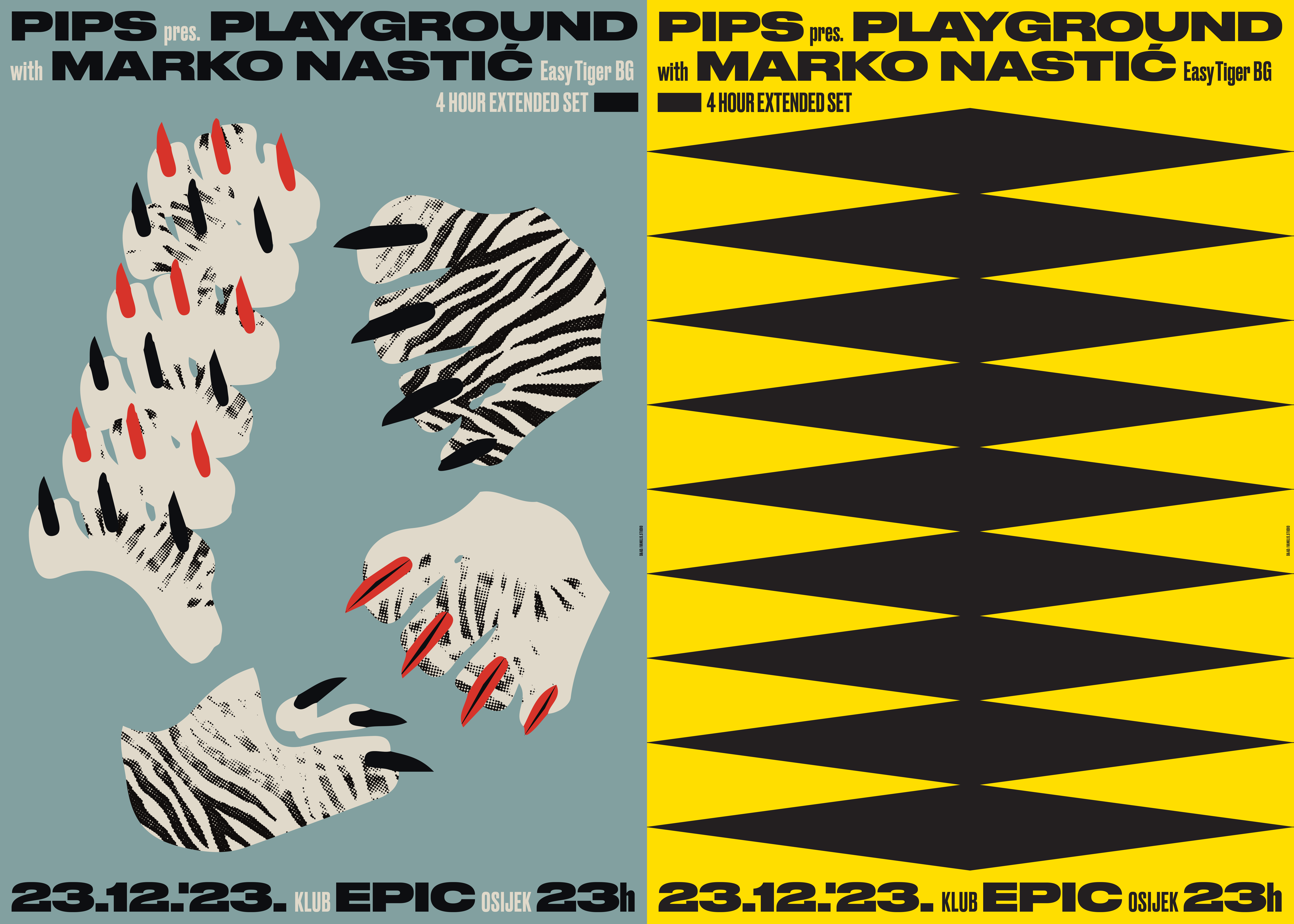 Plakati klupske večeri Slavena Tušeka (DJ Pips) u osječkom klubu EPIC, uz gostovanje Marka Nastića, beogradskog DJ-a, rezidenta etikete Easy Tiger, koja je poslužila kao inspiracija za sam vizual. Plakat je mišljen kao kontrastni diptih, analogan vinilnim izdanjima (a/b strana ploče). Multipliciranjem samog vizuala/grafizma dodatno se potencira sam sadržaj, odnosno vrsta i karakter samog glazbenog događaja.