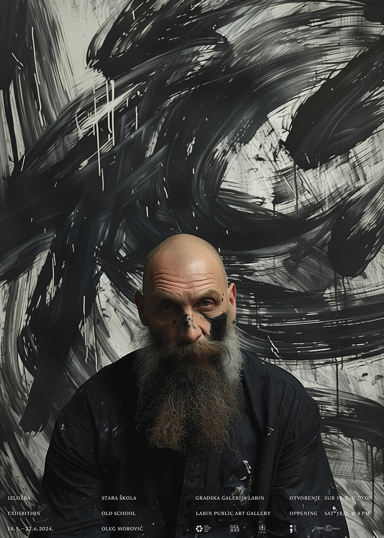 B2 plakat za izložbu Olega Morovića u Gradskoj galeriji Labin. Lik na plakatu pritom uopće nije Oleg Morović nego je riječ o fotografiji koja pokazuje kako ga zamišlja AI generator slika.