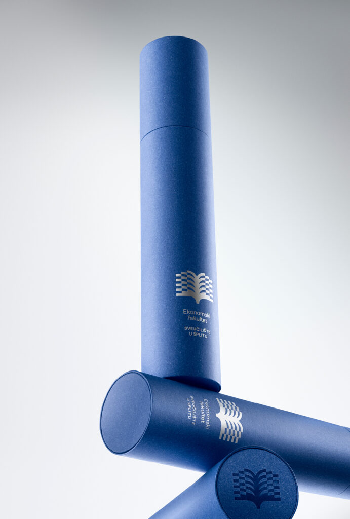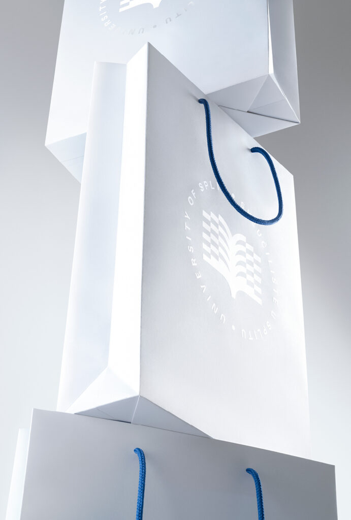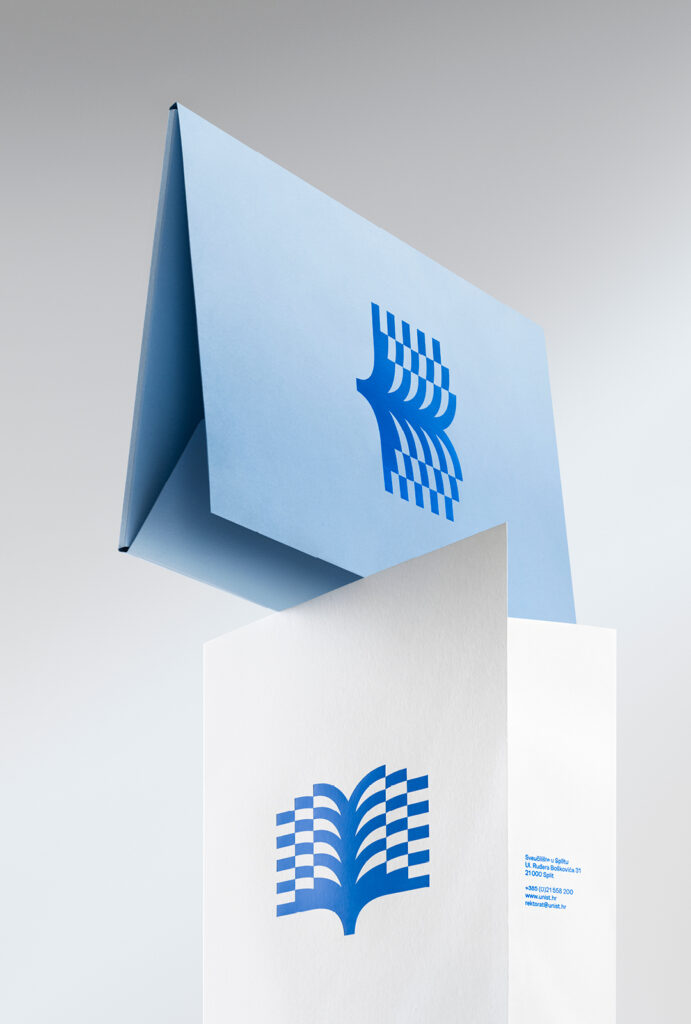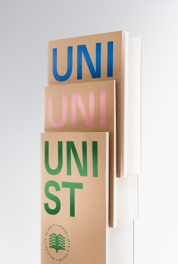 Otvorena knjiga, kanonski znak za sveučilište i simbol znanja i učenja, osnova je novog vizualnog identiteta Sveučilišta u Splitu. Izvedena u rasteru gotičkih kvadrata kakve nalazimo na grbu Grada Splita, ona se veže uz nacionalni identitet, ali i nosi brojne asocijacije vezane uz Split i njegovu mediteransku odrednicu. Postavljajući znak u različite odnose sa ekstenzijama – od punog naziva do skraćenice UNIST – vizualni identitet omogućava gradiranje od formalnog/ceremonijalnog do opuštenog/studentskog karaktera.