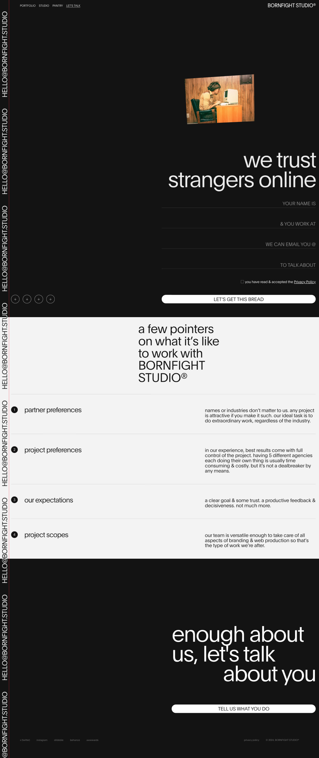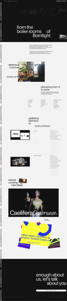 Web stranica osmišljena je kako bi predstavila Bornfight Studio, digitalni studio fokusiran na branding, web dizajn i development. Dizajn i funkcionalnosti naglašavaju stručnost u kreiranju modernih web rješenja te ističu posvećenost detaljima, tehničkoj preciznosti i estetskoj izvrsnosti.